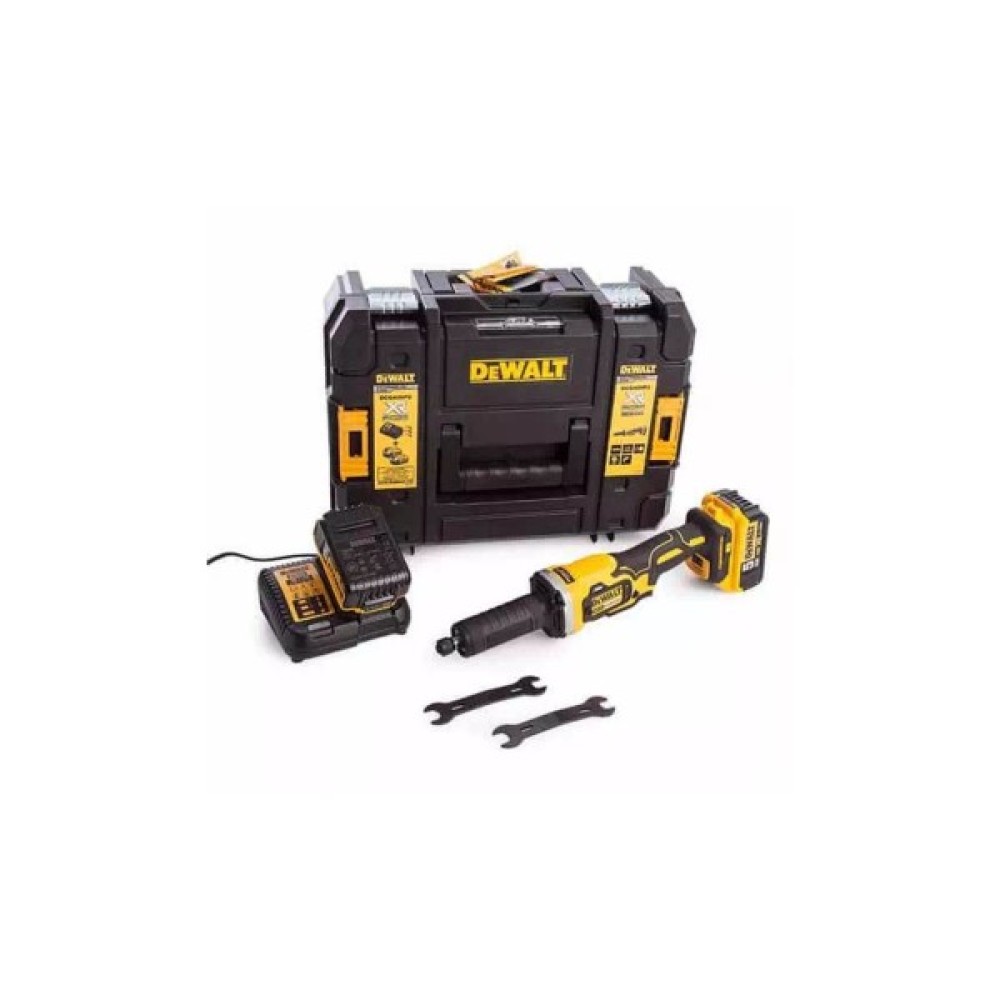 Комплектація цього пристрою включає цангу 6 мм, гайковий ключ, а також два акумулятори 18V XR Li-Ion по 5 Ампер-годин кожен, що гарантує тривалу автономну роботу та швидку зарядку завдяки зарядному пристрою, доступному в наборі. Всі компоненти зберігаються у зручній валізі, що полегшує транспортування та зберігання інструменту. Регулятор обертів та захисна сітка, яка запобігає забрудненню двигуна, забезпечують довготривалість служби вашого інструмента.