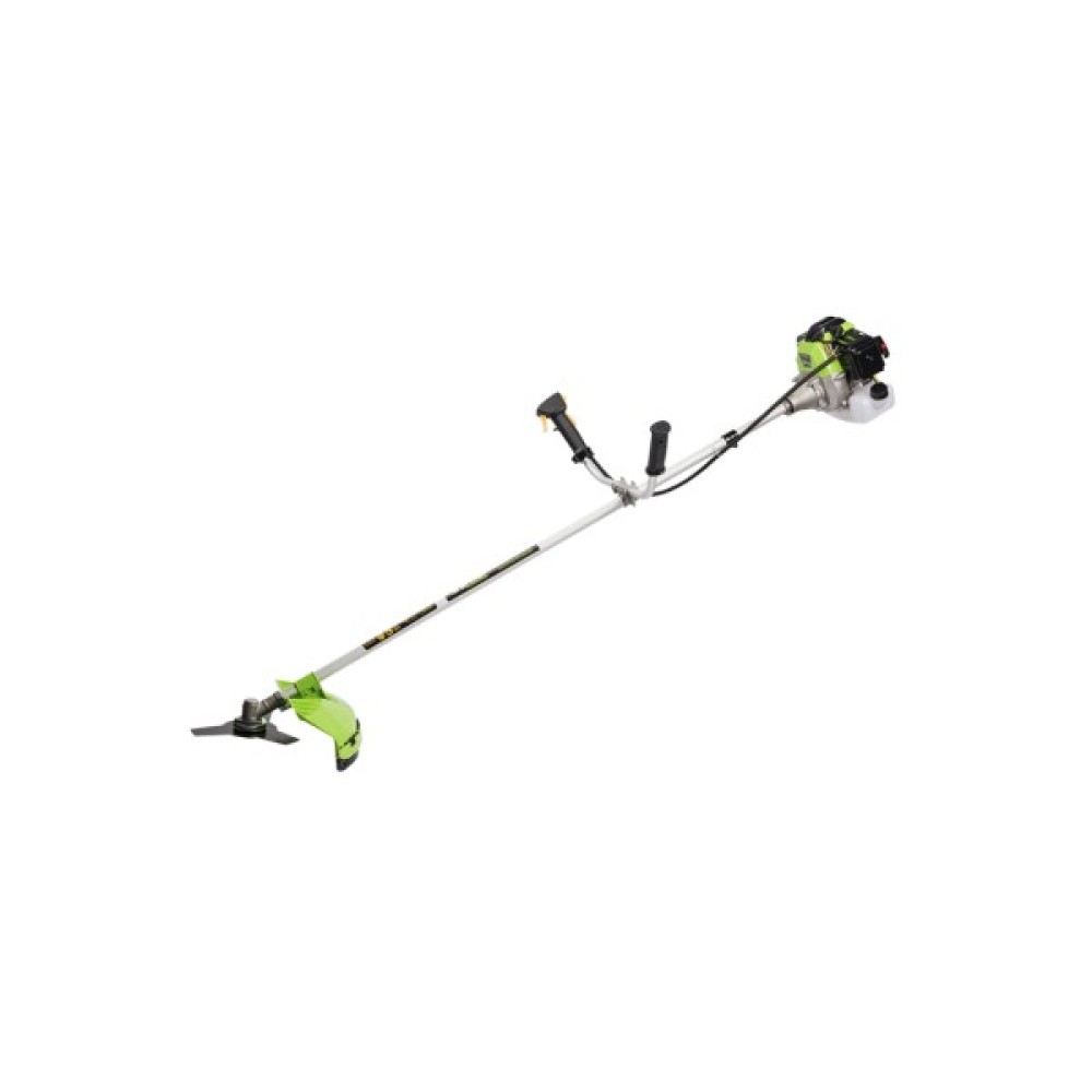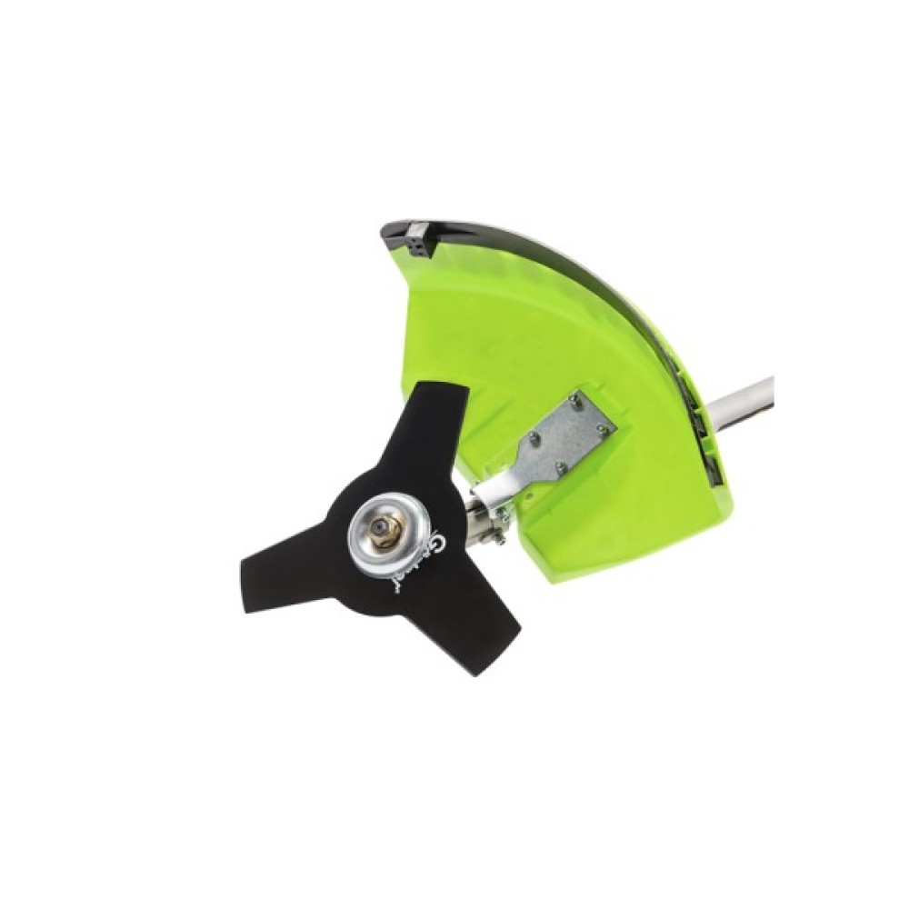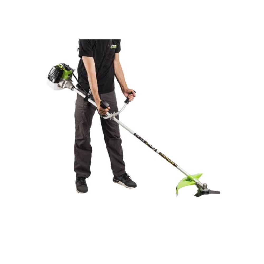 Наявність захисного кожуха захищає оператора та навколишнє середовище від розльоту скошеної трави, каміння і твердих предметів. Оснащення виробу наплічним або ранцевим ременем дозволяє звільнити руки оператора в процесі роботи.