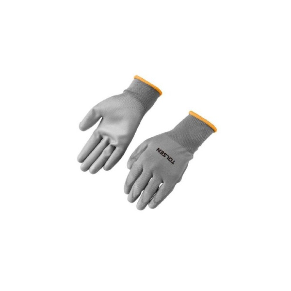 Рукавички Tolsen з поліестеру з поліуретановим покриттям забезпечують надійний захист рук під час монтажних, будівельних та господарських робіт. Еластична основа добре прилягає до руки, а ПУ-покриття гарантує міцне зчеплення з інструментом і матеріалами. Ідеальний варіант для професійного та побутового використання.