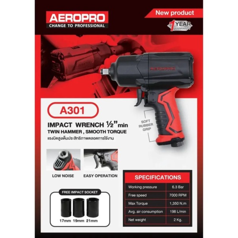 Гайковерт пістолетного типу широко використовується в автомайстернях, на виробництві, під час виконання монтажних робіт, ідеально підходить для шиномонтажу. Його робочий тиск до шести атмосфер у разі витрати повітря 142 л/хв максимальне зусилля 1700 Нм на швидкості обертання 7000 обертів за хвилину, що забезпечує вищу продуктивність. Внутрішній діаметр шланга має бути від 8 до 10 міліметрів, що дасть гайковерту працювати на повну потужність. Зручна прогумована ручка дасть вам безпечно та комфортно працювати. Ця модель гайковерта обладнана п'ятирежимним перемикачем потужності й реверсом.