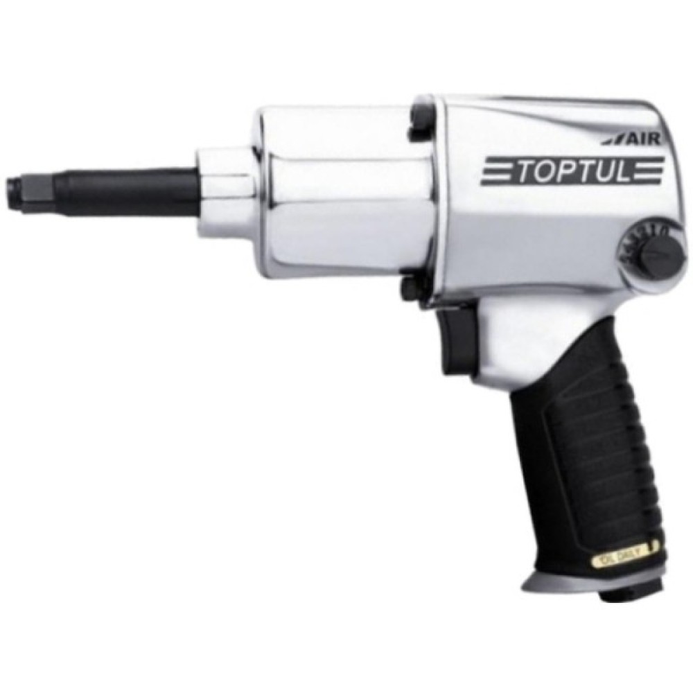 Пневмогайковерт Toptul KAAB1660 приєднувальний квадрат 1/2", з максимальним створюваним зусиллям 813 Н/м, і швидкістю обертання 6500 об/хв, з виведенням повітря з нижньої частини ручки та шумоглушником.
