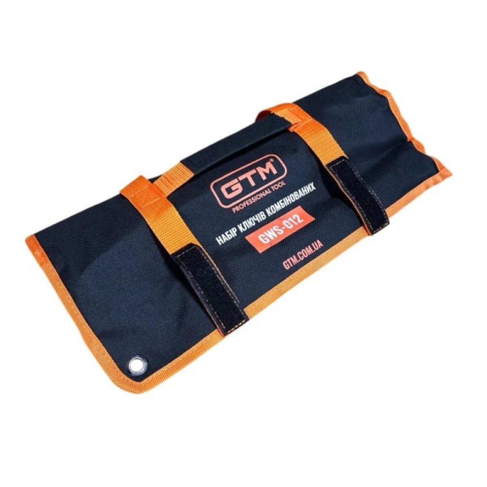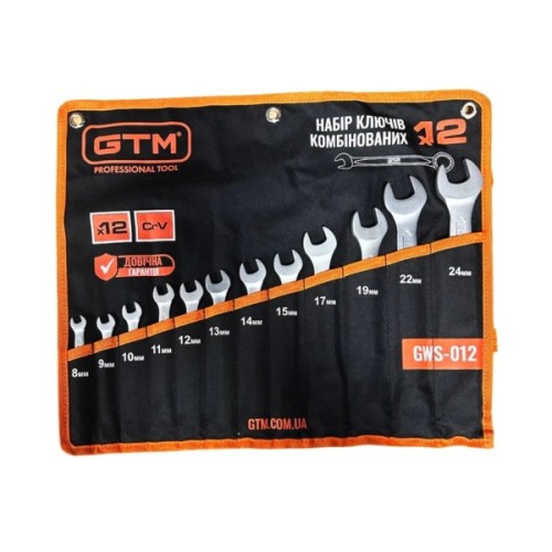 GTM GWS-012 - набір комбінованих гайкових ключів для закручування/викручування болтів, гайок та інших різьбових з'єднань. Даний набір поставляється в зручному тканинному чохлі, який дозволяє компактно зберігати їх як в багажнику автомобіля, так і на полиці в майстерні. Даний набір призначений для професійного застосування, але підійде також для роботи в побуті..