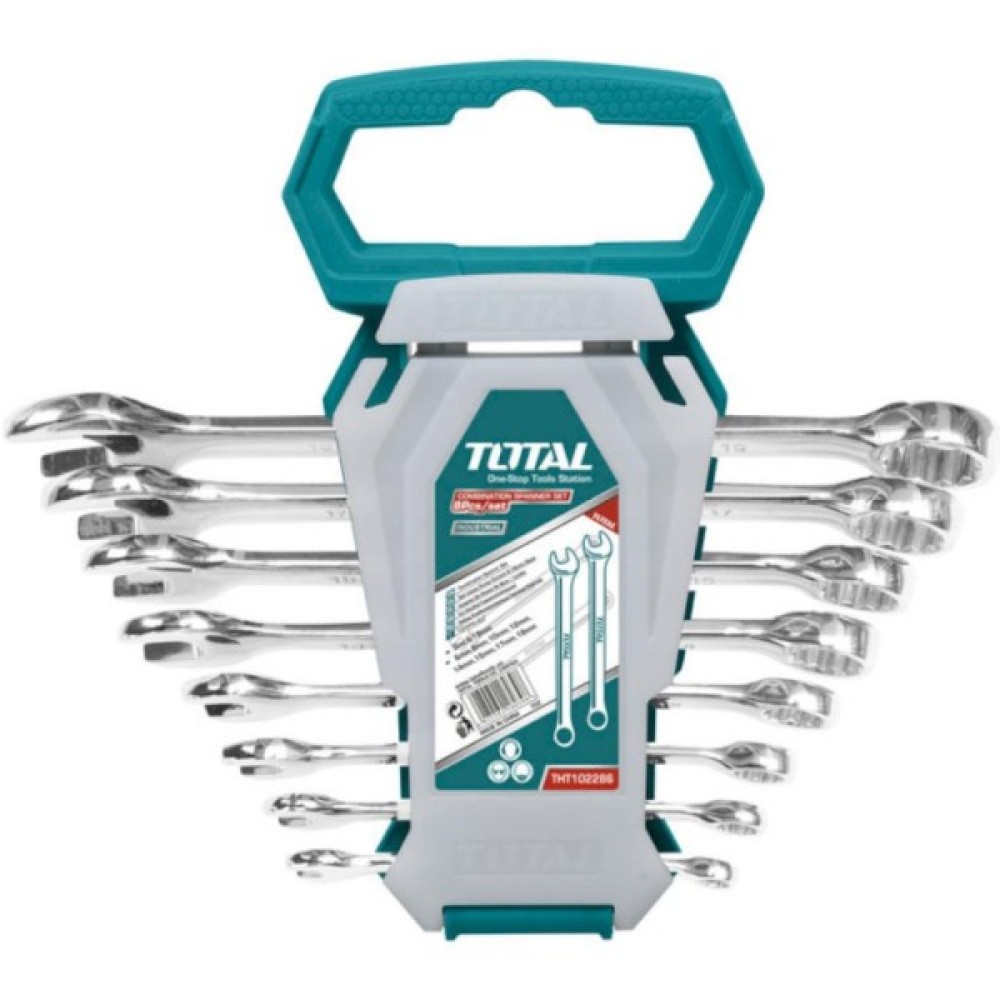 Набір ключів TOTAL THT102286-I налічує 8 комбінованих гайкових ключів із накидними та ріжковими головками розміром 6 мм, 8 мм, 10 мм, 13 мм, 14 мм, 15 мм, 17 мм, 19 мм. Усі ключі виготовлені з міцної сталі Cr-V і прекрасно відполіровані. Для зручності зберігання й транспортування ключі постачаються в пластиковому підвісному футлярі.