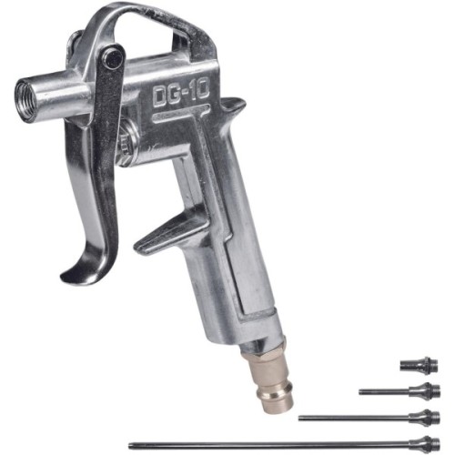 Продувний пістолет Einhell з 4 соплами - це відповідний комплект приладдя для всіх компресорів Einhell. За допомогою чотирьох різних довгих і вузьких сопел (довжина: 20 мм, 50 мм, 95 мм, 220 мм) можна без проблем продути навіть важкодоступні місця і вузькі ніші. Пістолетна форма забезпечує легке і приємне поводження, а завдяки ніпелю для швидкого з'єднання продувний пістолет можна легко встановити на компресор. Продувний пістолет розрахований на тиск повітря від 2 до 8 бар.