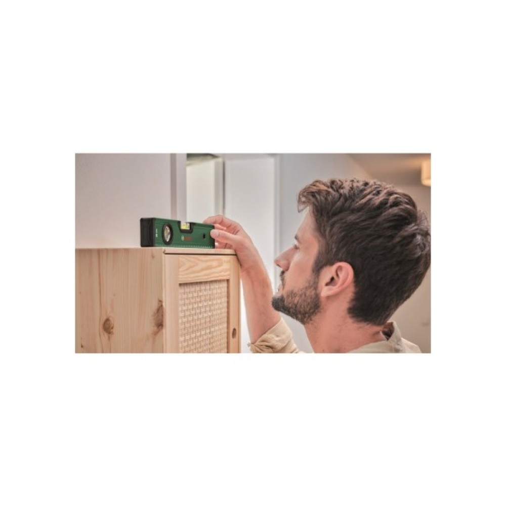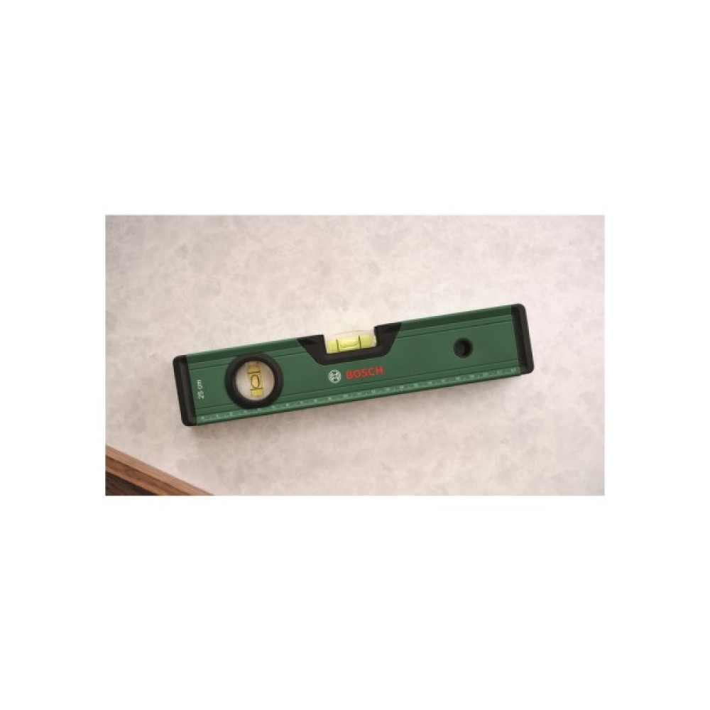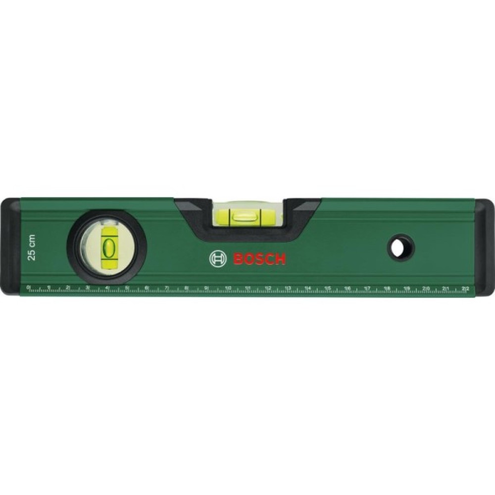 З рівнем Bosch Spirit Level 25 см полиці та картини висітимуть рівно за лічені секунди. Цей зручний універсальний інструмент забезпечує високоточні результати до 0,05 мм/м завдяки горизонтальному та вертикальному бульбашковим рівням. Завдяки яскравій флуоресцентній бульбашковій рідині у флаконах рівень легко зчитується. Цей рівень має метричну шкалу 0-22 см, тому вам не потрібно шукати другий інструмент, оскільки він виконує функцію лінійки.