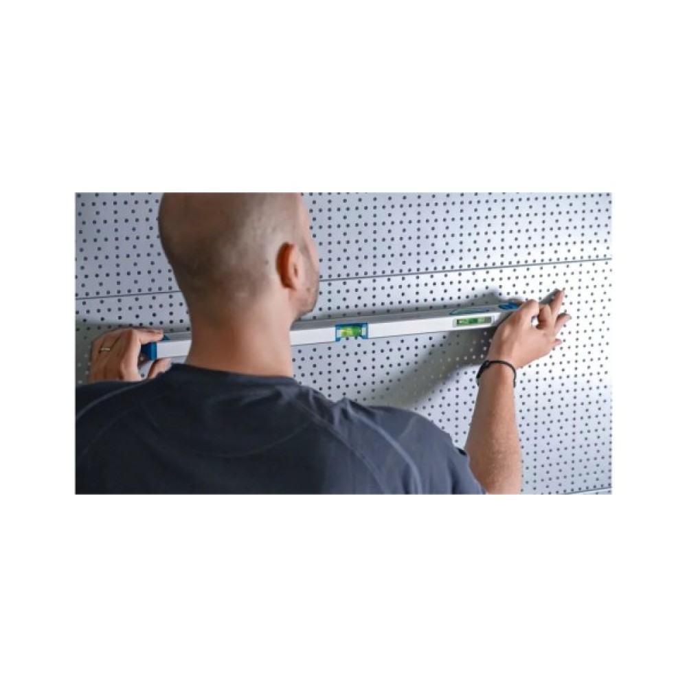 60-сантиметровий рівень оснащений ударостійкими наконечниками, блоковими ампулами та міцним алюмінієвим корпусом, що гарантує тривалий термін служби на будівельному майданчику. Антиковзаючі торцеві ковпачки допомагають запобігти відхиленням на дисплеї і забезпечують додаткову стабільність під час використання. Тонкий дизайн корпусу та текстурована поверхня на нижній частині забезпечують ергономічне використання. Рівень зручний у використанні завдяки хорошій видимості показань і відмінному зчепленню з поверхнею.