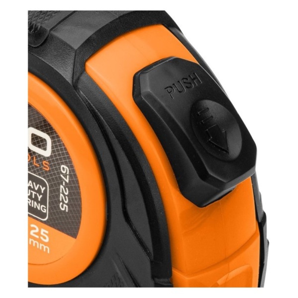 Рулетка сталева 10 м х 25 мм, автоматичний стопор, дві кнопки зупинки 67-225 від NEO TOOLS - це інструмент з рулеткою довжиною 10 м і шириною 25 мм. Оснащена практичною функцією автоматичної зупинки, яка запобігає самостійному втягуванню рулетки в розгорнутому стані, а також можливістю використання двох кнопок фіксації.