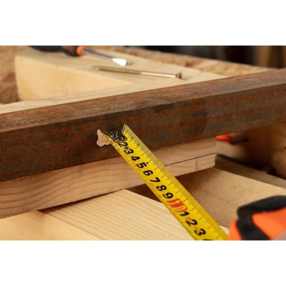 Рулетка сталева 7,5 м х 25 мм, автоблокування, кнопка стоп, магніт 67-234 від NEO TOOLS - це інструмент з рулеткою довжиною 7,5 м і шириною 25 мм. Оснащена практичною функцією автоматичної зупинки, яка запобігає самостійному втягуванню рулетки в розгорнутому стані, а також можливістю використання фіксуючого пристрою. Магніт сприяє кращій стабілізації рулетки, а збільшений друк впливає на швидкість зчитування результатів вимірювань. Рулетка NEO TOOLS виготовлена в корпусі з двох матеріалів. Він має блискуче покриття, що захищає поділки від стирання. У свою чергу, вбудований амортизатор впливає на більш плавний процес прокатки. Інструмент відповідає стандарту MID Class II. Додавання нейлону сприяє довговічності та комфорту використання цієї рулетки NEO TOOLS.