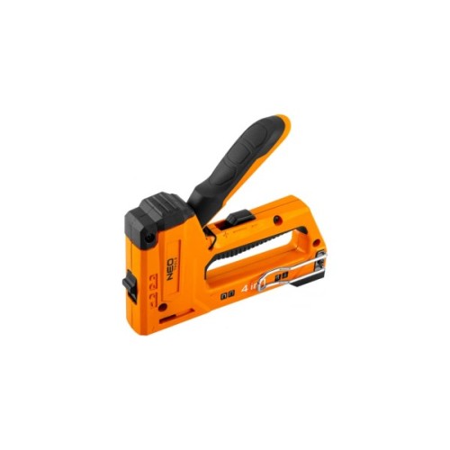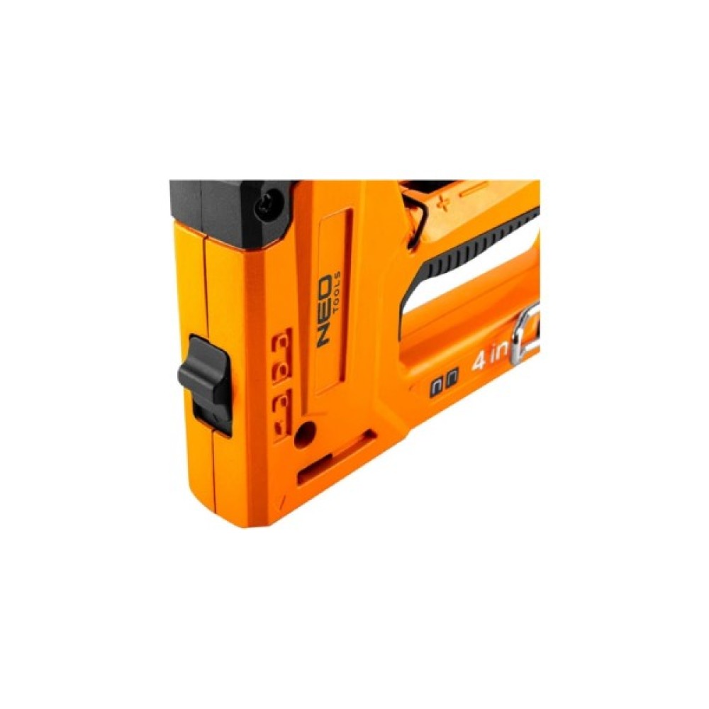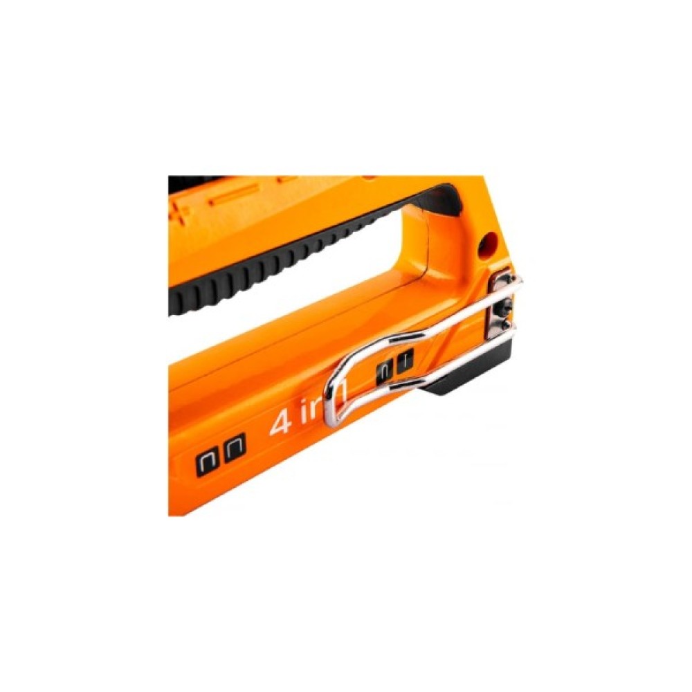 Степлер меблевий, багатофункціональний, 4 в 1, скоби 6-14 мм, для скоб типу J, G, L, E, корпус з алюмінію, профільована ручка, покрита пластиком, регульоване зусилля притиску скоб, простий вибір типу скоб за допомогою слайдера, затискач для кріплення на пояс, замок безпеки