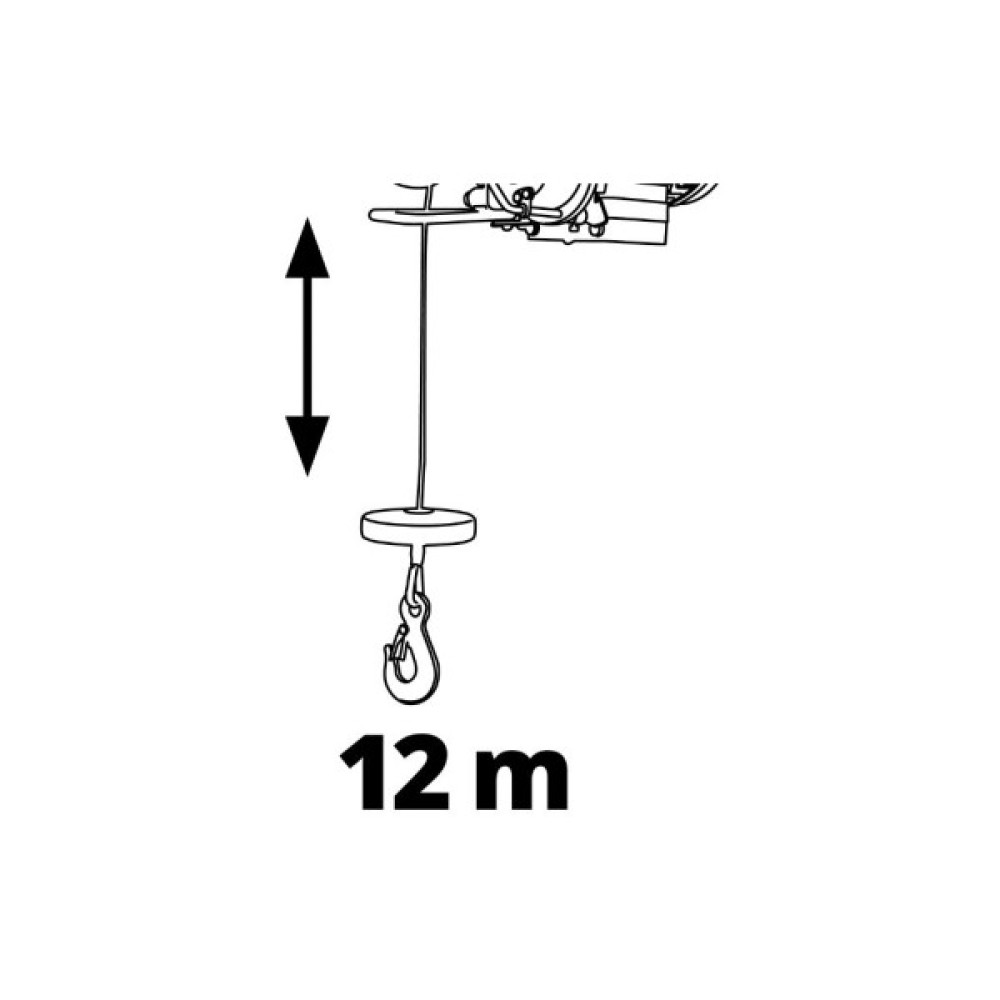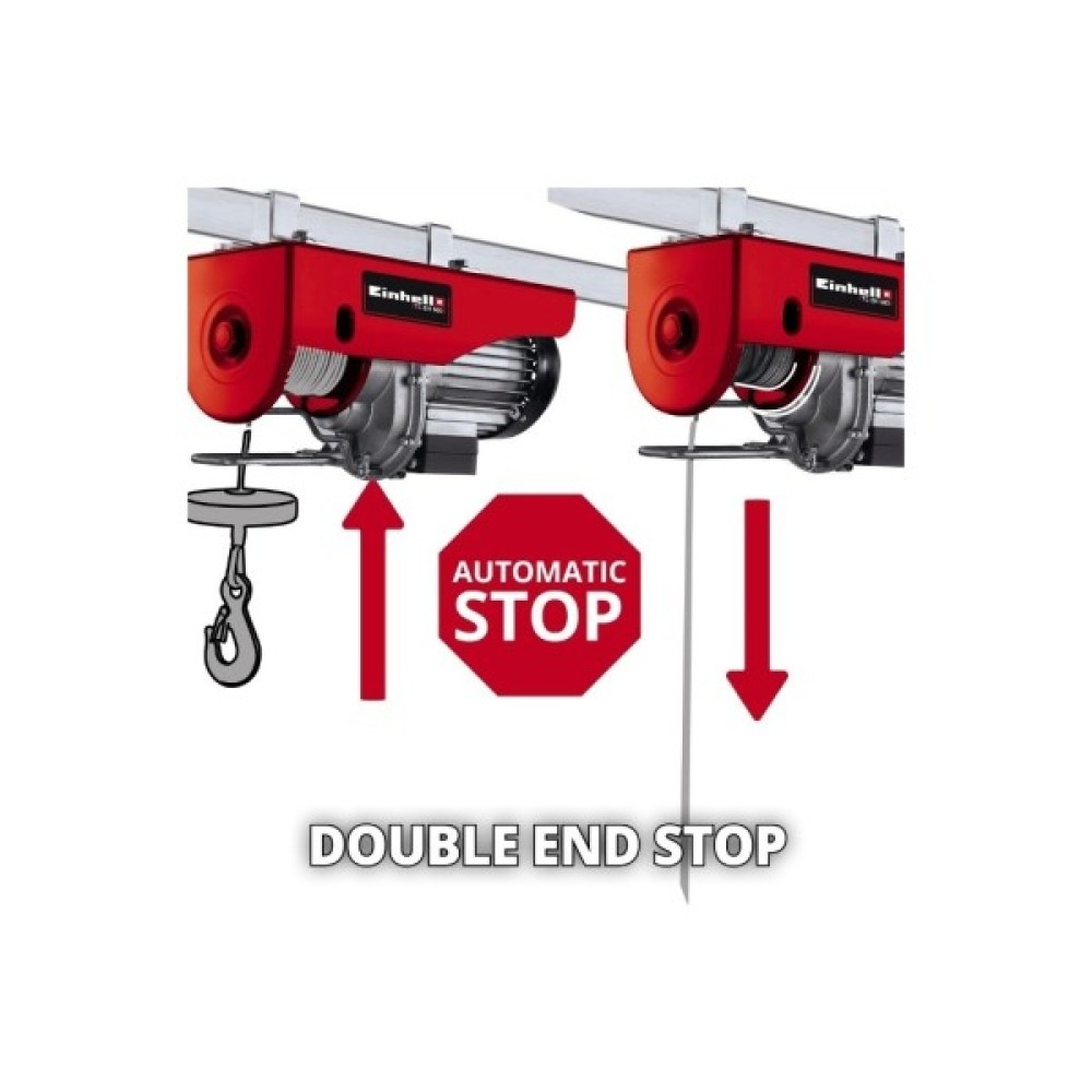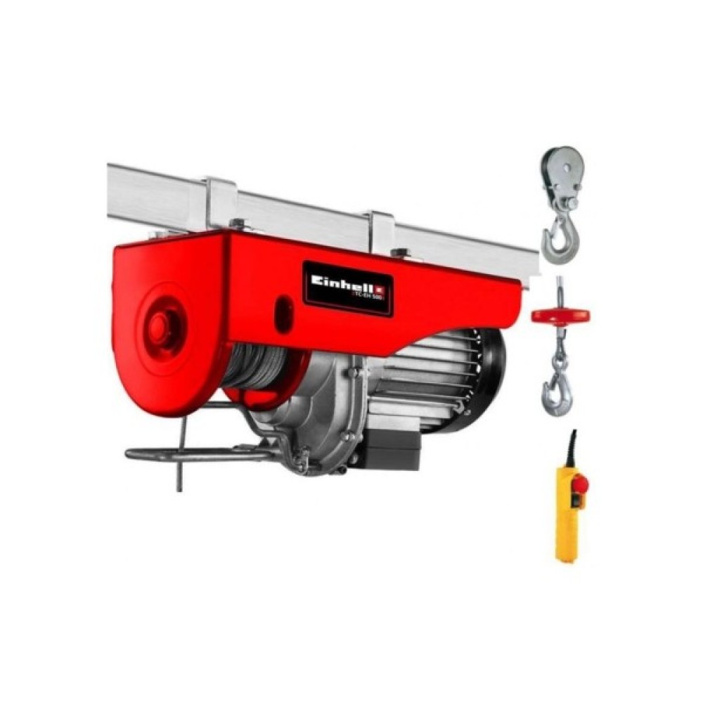 Тельфер електричний Einhell TC-EH 500, 1000 Вт, до 500 кг, трос 12 м 2255140. Тельфер електричний Einhell TC-EH 500 - це потужний пристрій, при створенні якого особлива увага приділялася безпеці роботи. Завдяки тросу довжиною 12 метрів та діаметром 4 мм із захистом від перекручування вантаж масою 500 кг може бути піднятий на висоту 5.7 метрів з використанням зворотного шківа (250 кг на висоту 11.5 метрів без використання зворотного шківа). Оснащення двигуна термостатичним вимикачем забезпечує тривалий термін служби.