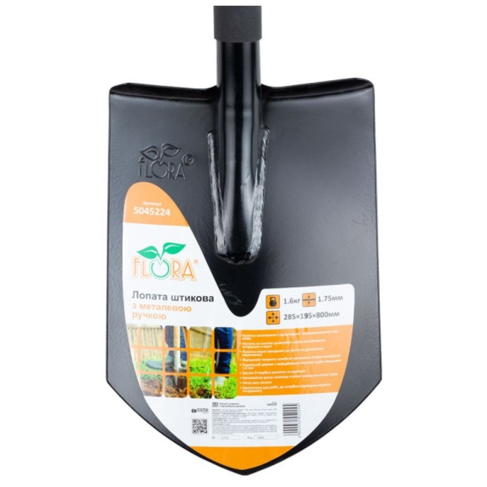Лопата штикова з металевою ручкою 285×195×800мм 1.6кг FLORA (5045224) це ручний інструмент, призначений для копання, розчищення або перенесення ґрунтів та інших сипучих і рихлих матеріалів.