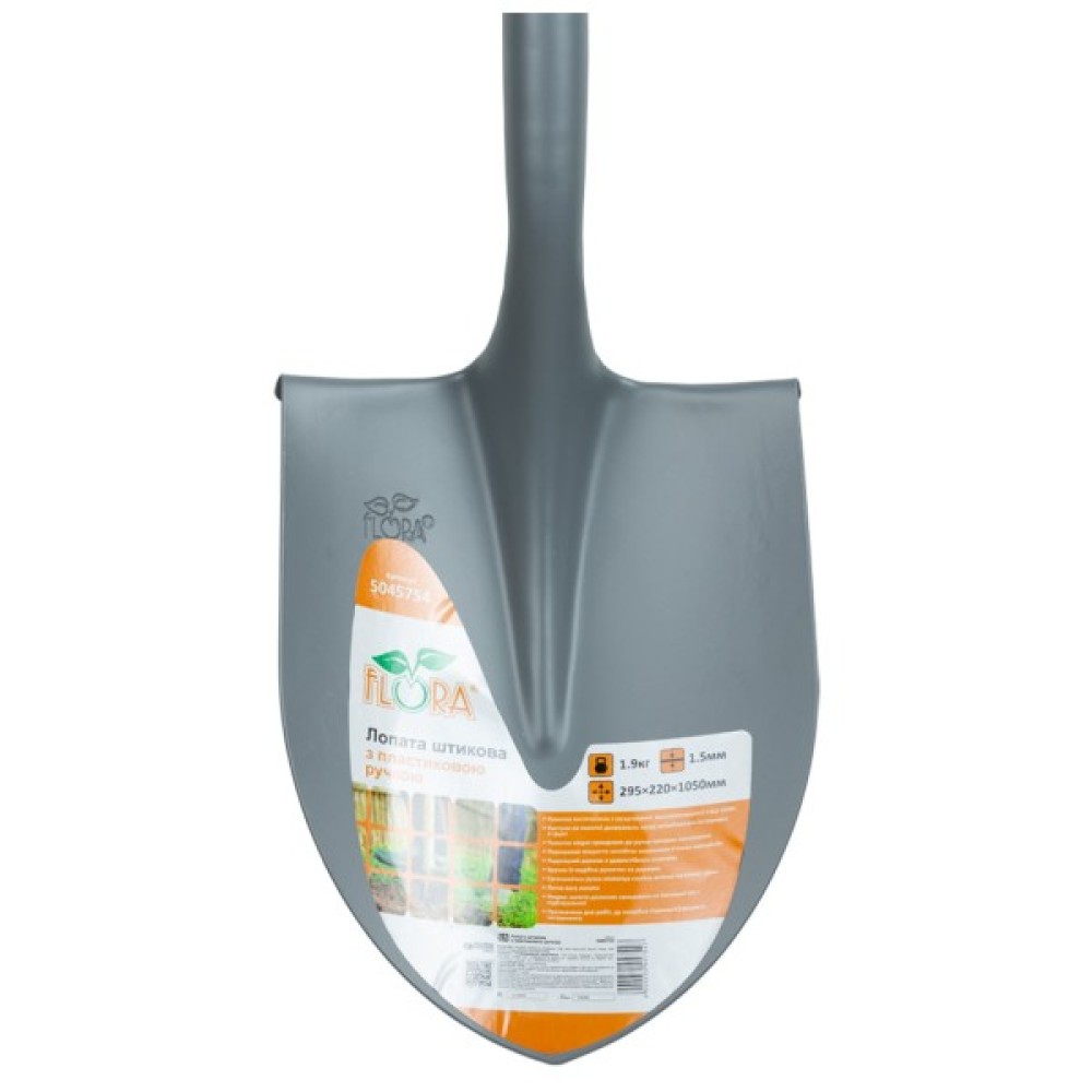 Лопата штикова з пластиковою ручкою 295×220×1050мм 1.9кг (американка) FLORA (5045754) це ручний інструмент, призначений для копання, розчищення або перенесення ґрунтів та інших сипучих і рихлих матеріалів.