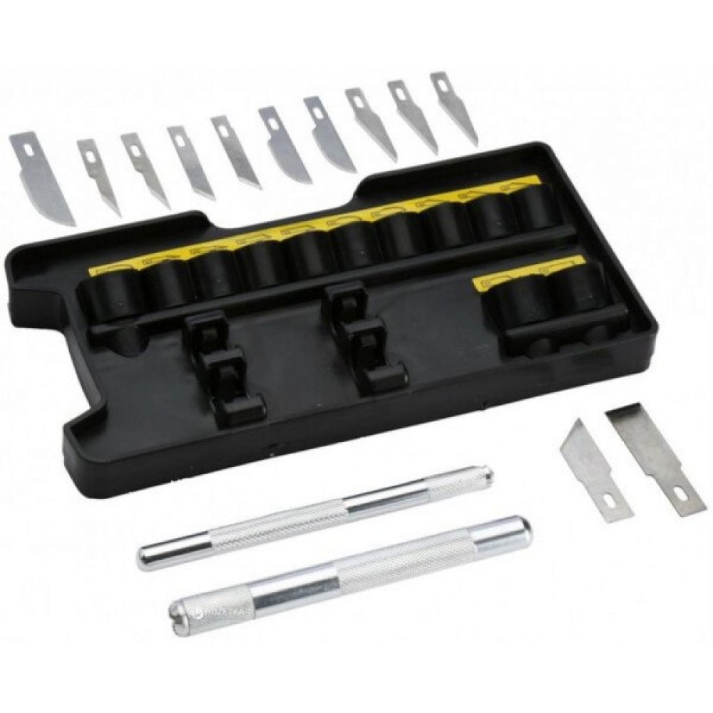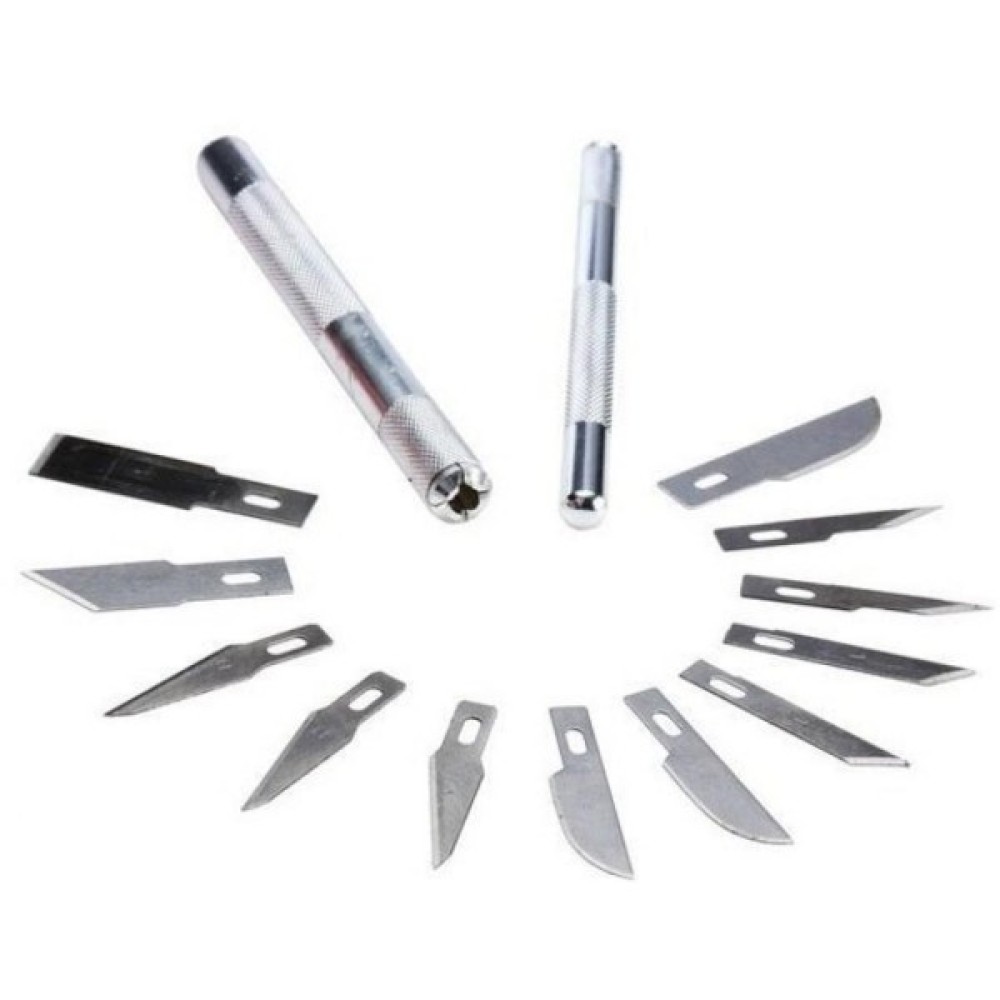 Даний набір складається з дванадцяти лез для дрібних робіт різної форми, а також спеціальні ручки. Вони виготовлені з високоякісного металу, що забезпечує високу ефективність взаємодії користувача з даним товаром, а також досить тривалий термін їх експлуатації.