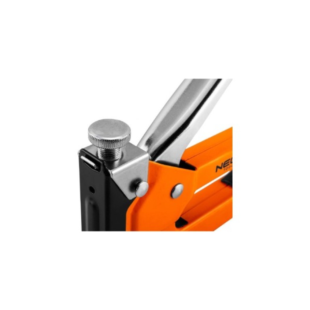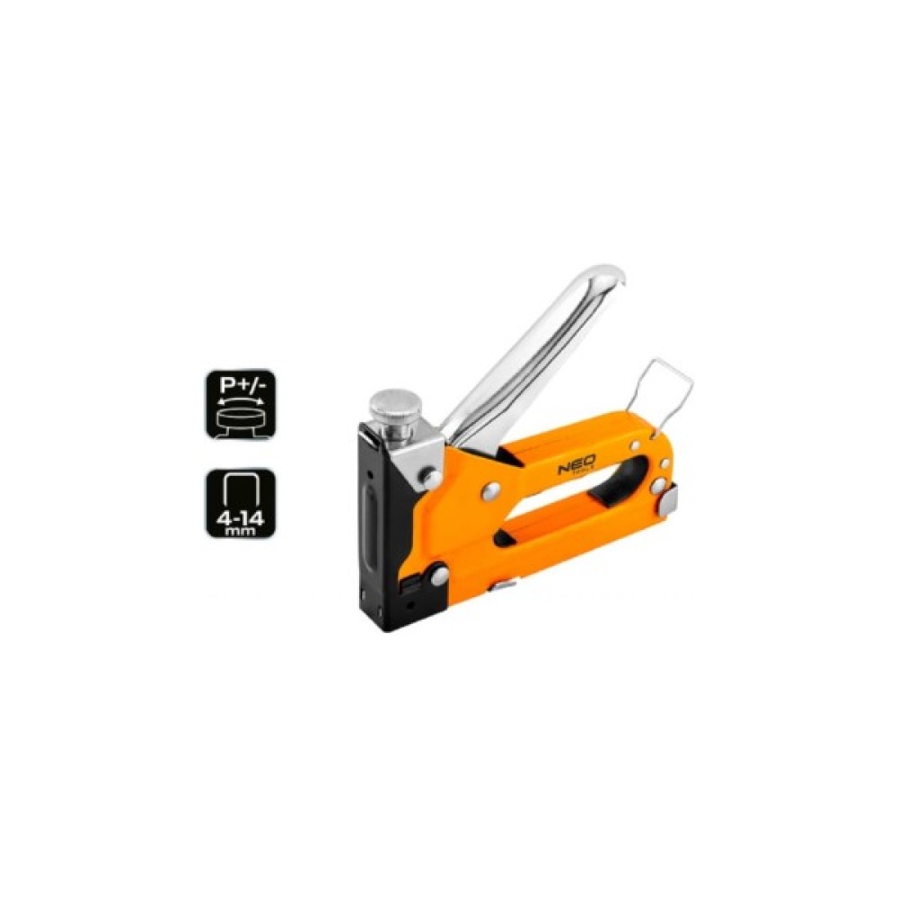 Степлер NEO Tools 4-14 мм, скоби J, сталь 16-032 призначений для роботи з меблями. Степлер має зручну ручку з функцією регулювання зусилля притиску скоб. Оснащений затискачем для кріплення на пояс та замком безпеки.