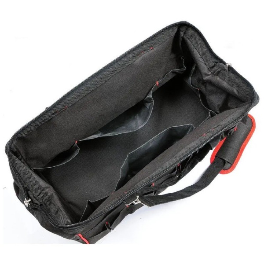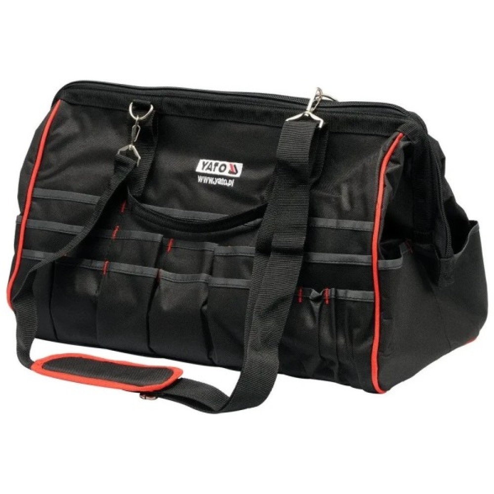 На відміну від ящика, сумка набагато зручніша при перенесенні в руці, оскільки не має жорстких ребер і при ходьбі немає необхідності відводити руку убік. Комплектація інструментальної сумки YATO YT - 7430 включає одне велике відділення, внутрішні і зовнішні кишені, що дають можливість максимально зручно розкласти приладдя за типом, частоти використання і розміру.