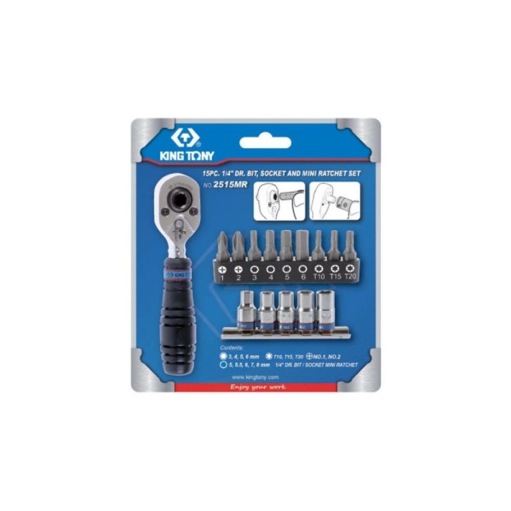 Тріскачка KING TONY під біти та головки 1/4", з набором біт та головок 15 шт. (2515MR)