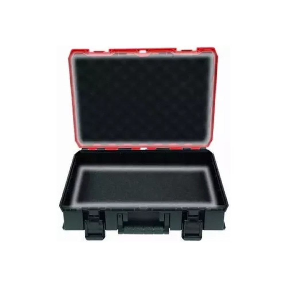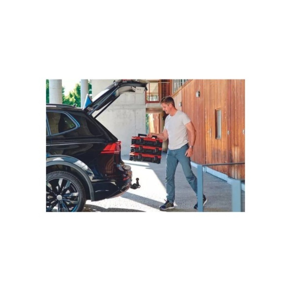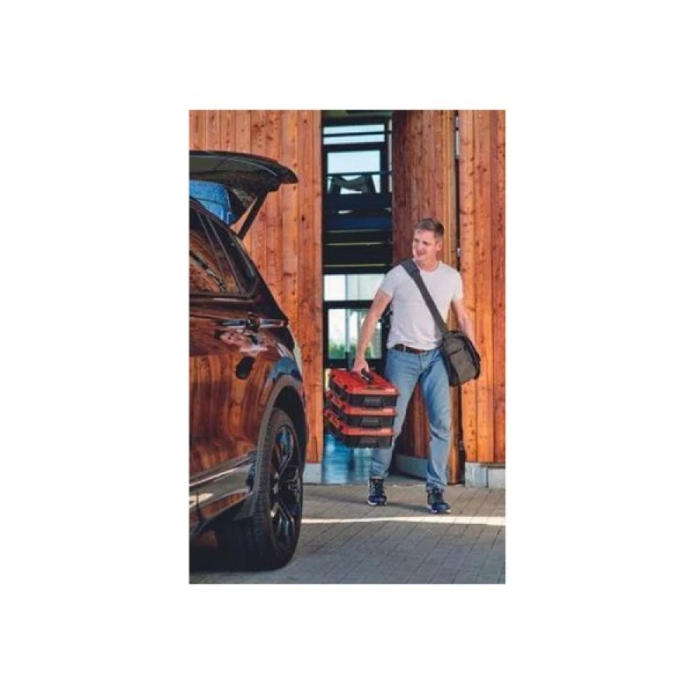 Кейс пластиковий універсальний Einhell E-Case S-F забезпечує простий спосіб зберігання і зручне транспортування. Системний кейс ідеально підходить для зберігання і транспортування інструментів і аксесуарів. Завдяки внутрішнім розмірам 420,9 мм x 280,3 мм x 95,4 мм і максимальній навантажувальній вазі 25 кілограмів, цей високоякісний системний кейс забезпечує максимальну гнучкість і може вмістити різні пристрої, включно з насадками та аксесуарами, як-от гвинти і свердла. Дві вставки з поролону забезпечують захист від подряпин для обладнання, що зберігається або транспортується. Практична система фіксації для з'єднання складених кейсів разом гарантує, що все можна систематично і акуратно зберігати організовано, а складені кейси легко транспортувати, а завдяки розумній конструкції навіть складені кейси можна відкривати. Корпус кейса Einhell E-Case S-F виготовлено з високоякісного пластику, а тому він не тільки захищений від бризок завдяки ергономічному дизайну, а й є термостійким і ударостійким. Для оптимального комфорту під час транспортування є дві складні ергономічні ручки. Корпус може бути обладнаний навісними замками для захисту від крадіжки.