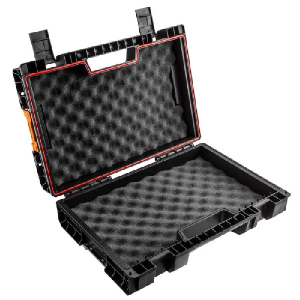 Ящик для електроінструментів NEO розмір 448 (Д) x 322 (Ш) x 126 (В) мм, об'єм 11 літрів, прокладка в кришці, захист від води та пилу, бічні роз'єми з поліаміду, посилена конструкція корпусу, міцні застібки.