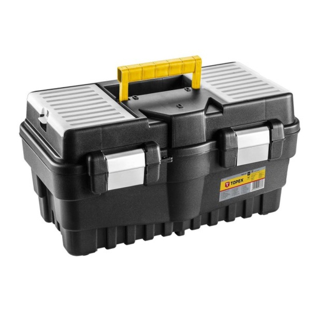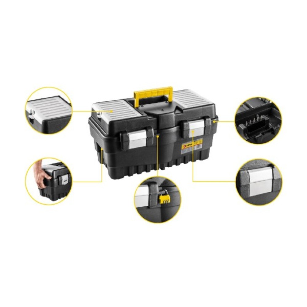 Ящик для інструменту ТОРЕХ - це практичний і міцний контейнер для інструменту, виготовлений з міцної пластмаси, з алюмінієвим замком.