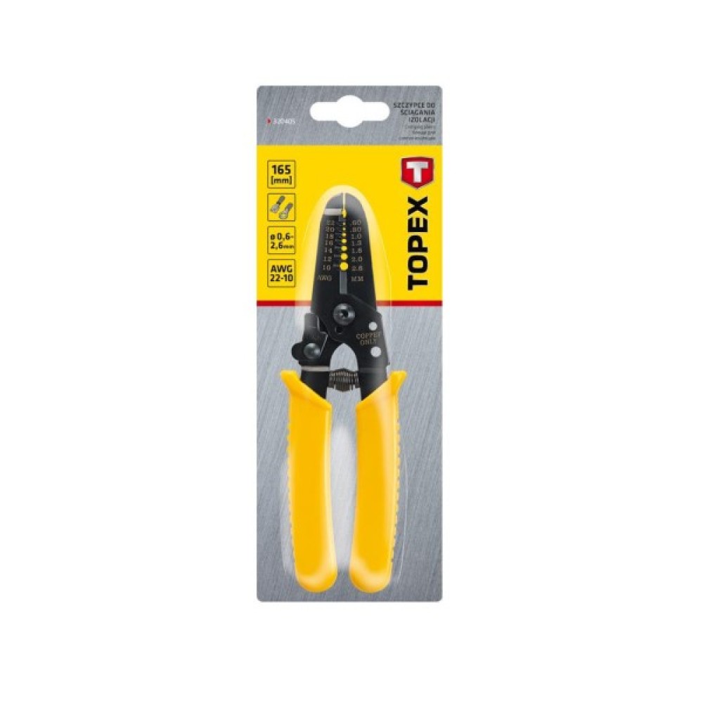 Кліщі для зачищення дротів TOPEX довжиною 165 мм, для дротів діаметром від 0.6 до 2.6 мм2. Призначені для обтиску ізоляції. Рукоятки, вкриті антиковзною пластмасою, забезпечують комфорт під час роботи. Бренд TOPEX призначений для домашніх майстрів.