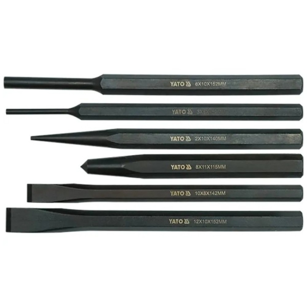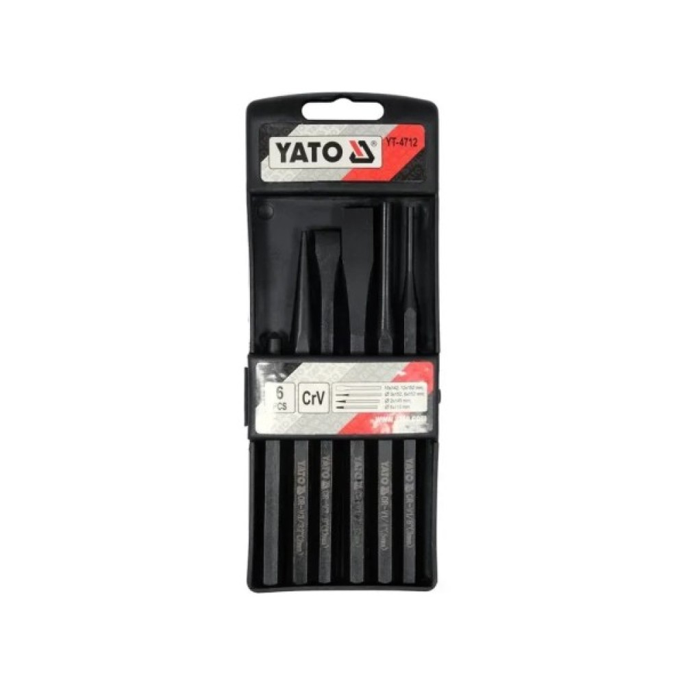 Набір зубил, кернів і перебійників YATO YT-4712 складається з 6 інструментів з якісної хром-ванадієвої сталі CrV60. Зубила, перебойнікі і керни стійкі до утворення іржі і корозії, а також показують прекрасні експлуатаційні якості. Технологія виробництва була вдосконалена, за рахунок цього набір здатний витримувати високі навантаження по час роботи.