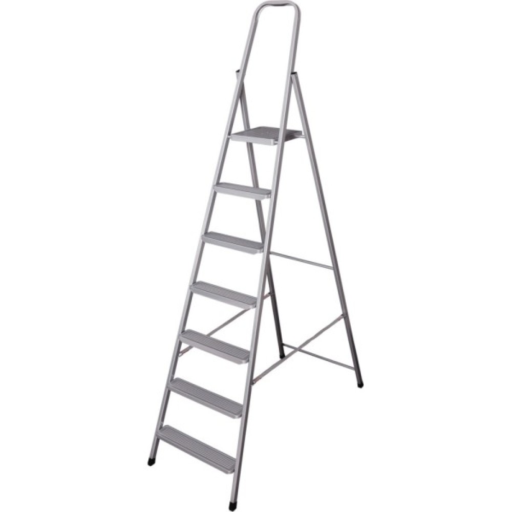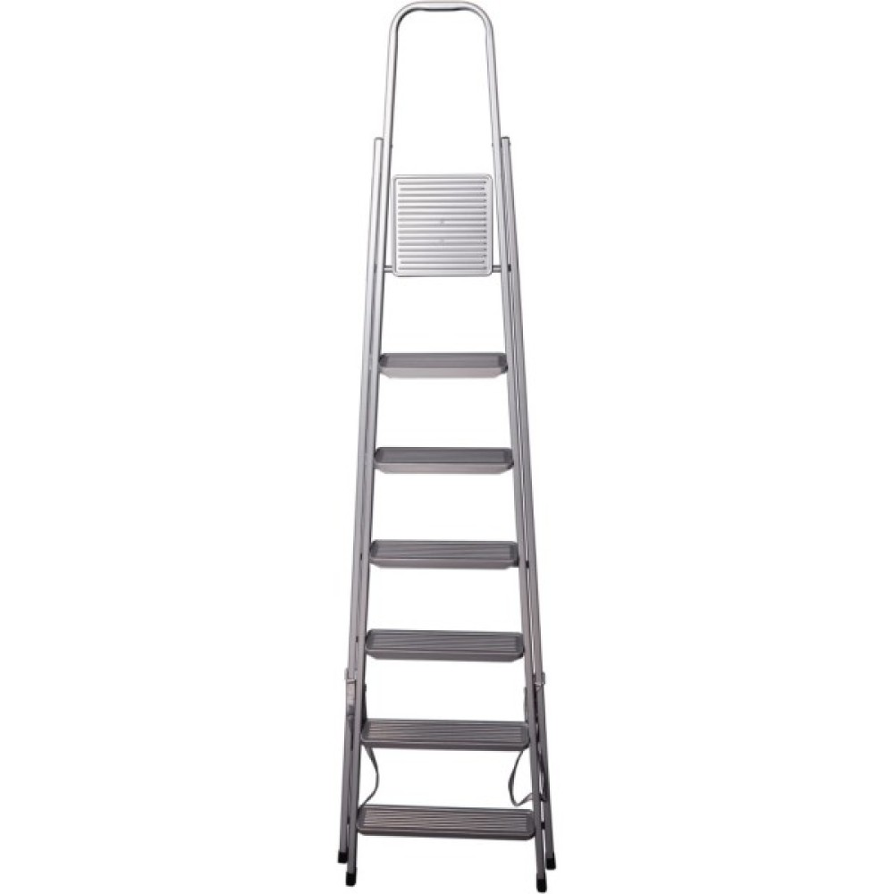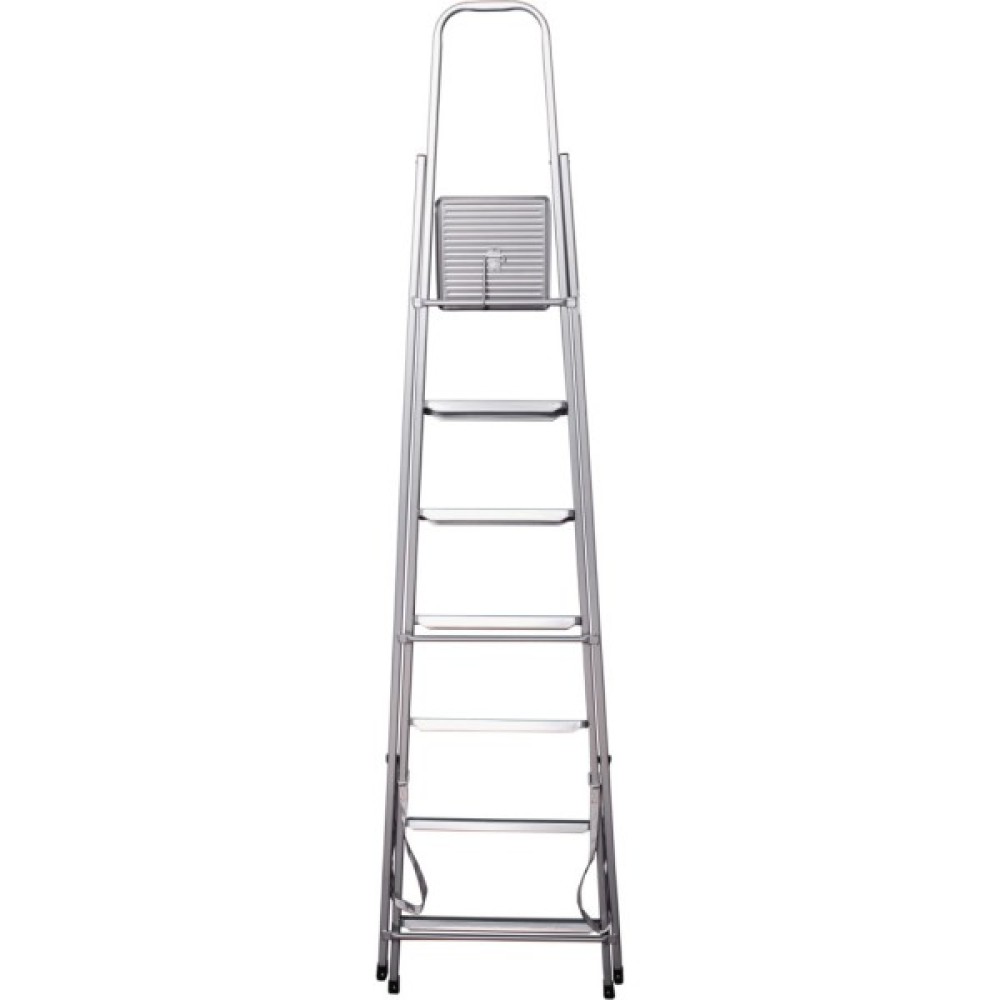 Надійна та стійка сталева драбина. Захисне епоксидне покриття робить виріб більш зносостійким. Ребриста поверхня сходинок протидіє ковзанню. Висока ручка надає додаткової зручності, дозволяючи відчувати себе безпечніше на висоті. Система складання забезпечує компактність та легкість у зберіганні.