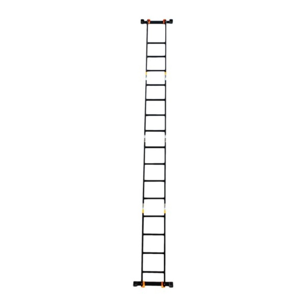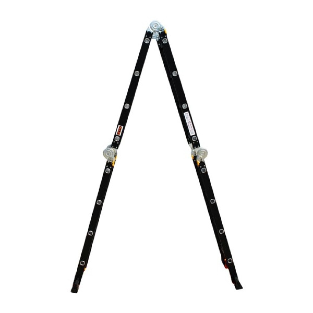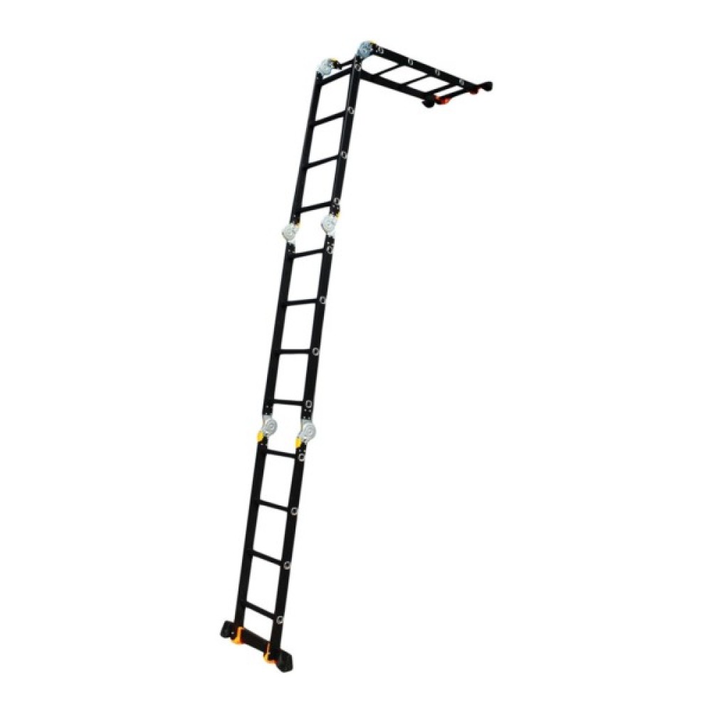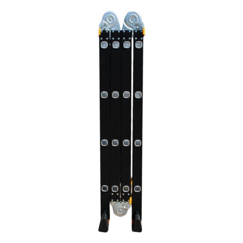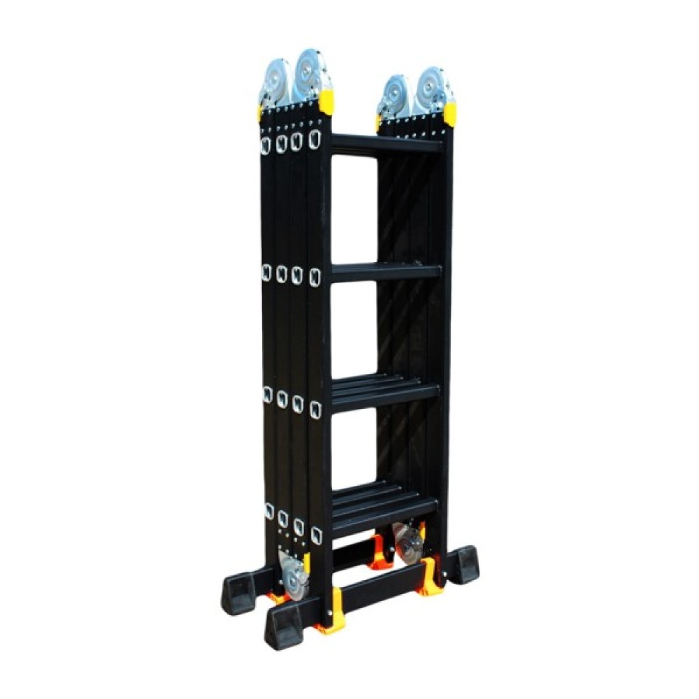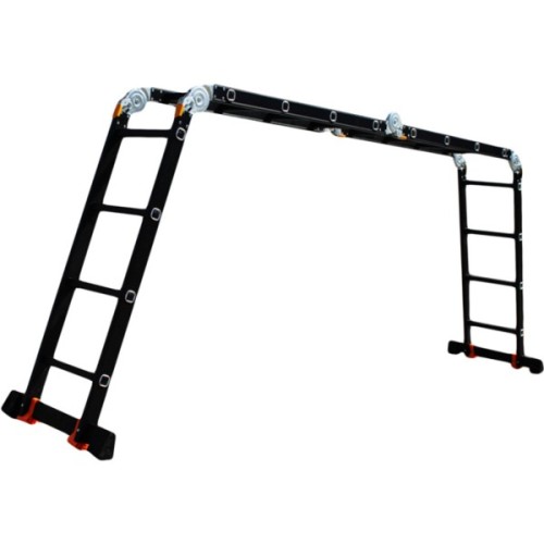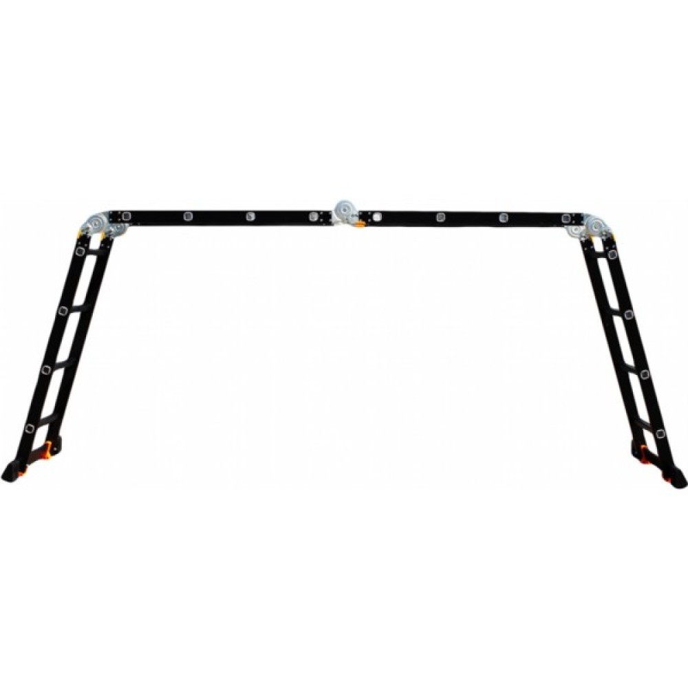 GTM KMP404A - легка драбина-трансформер підвищеної міцності, яка призначається для постійного промислового і побутового використання. Профіль виготовлений з авіаційного алюмінію, має змінну товщину стінки і додатково посилений ребрами жорсткості. Для додаткової стійкості до пошкоджень корпус пофарбований в чорний колір методом електрофорезу. Міцні шарніри і замки надійно фіксують сходи в будь-який з обраних форм. Завдяки такій конструкції трансформер GTM KMP404A здатний витримати без деформації навантаження в 150 кг.