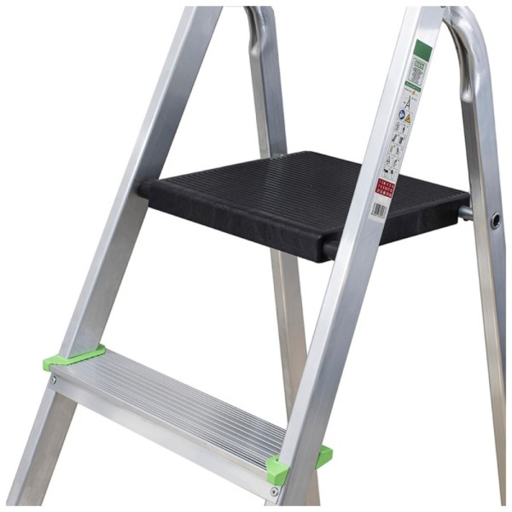 Одностороння підлогова алюмінієва переносна драбина (стрем'янка) для професійного використання, зі стабільною алюмінієвою платформою.