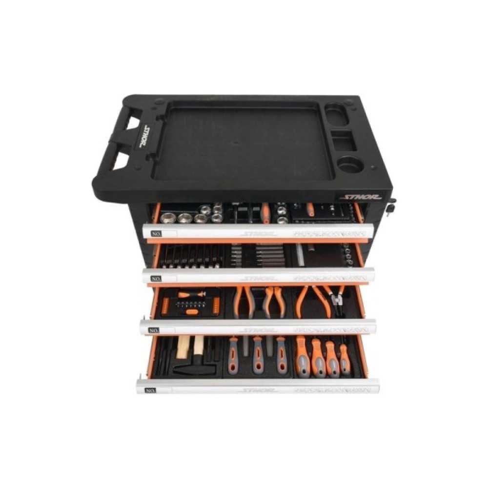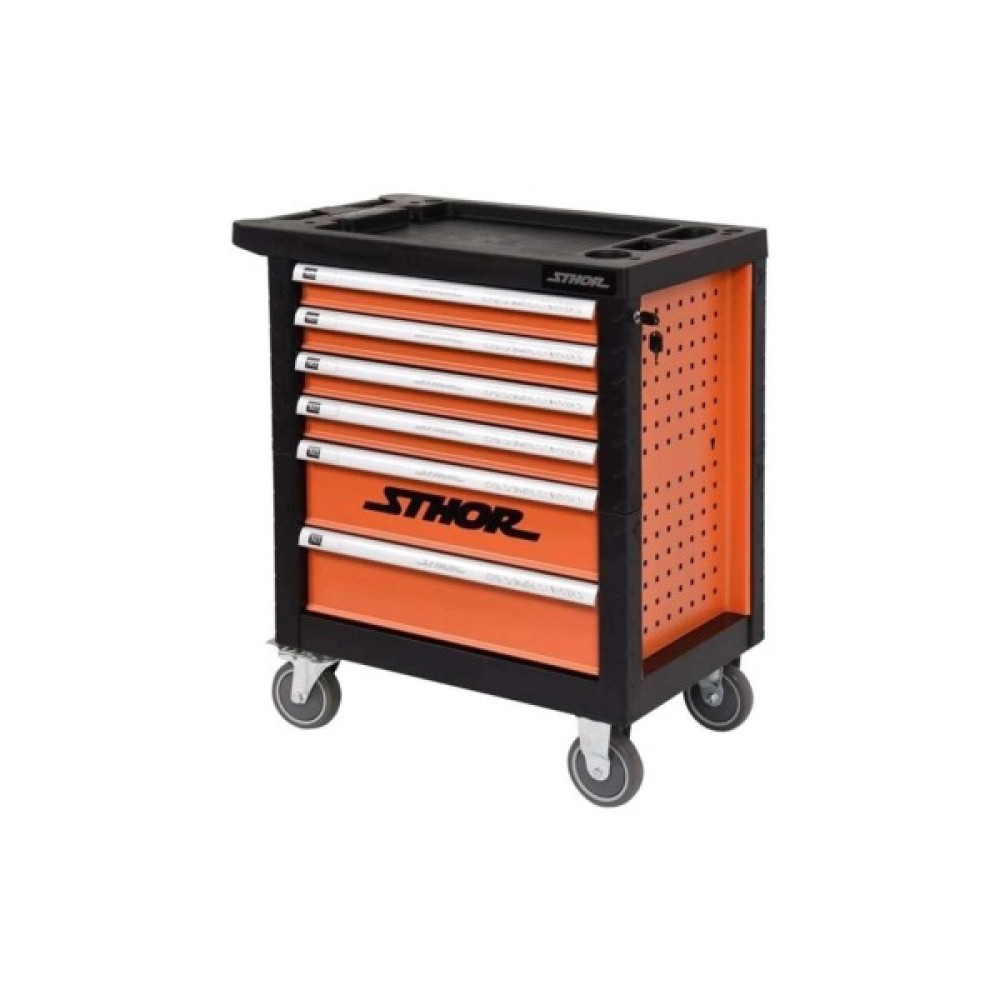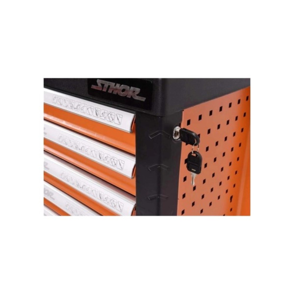 Сервісна шафа з інструментами STHOR. Має 6 висувних ящиків на кулькових напрямних, оснащених 12 пластиковими модулями з інструментами. Сервісна шафа STHOR містить 302 спеціально підібрані інструменти. Профілі шафи з листової сталі. Центральний замок і замок на кожну шухляду. Інструменти зі сталі CrV. Шафа має кутові бампери, які захищають від випадкових пошкоджень, наприклад, кузова автомобіля. Стільниця з міцного поліпропілену.
