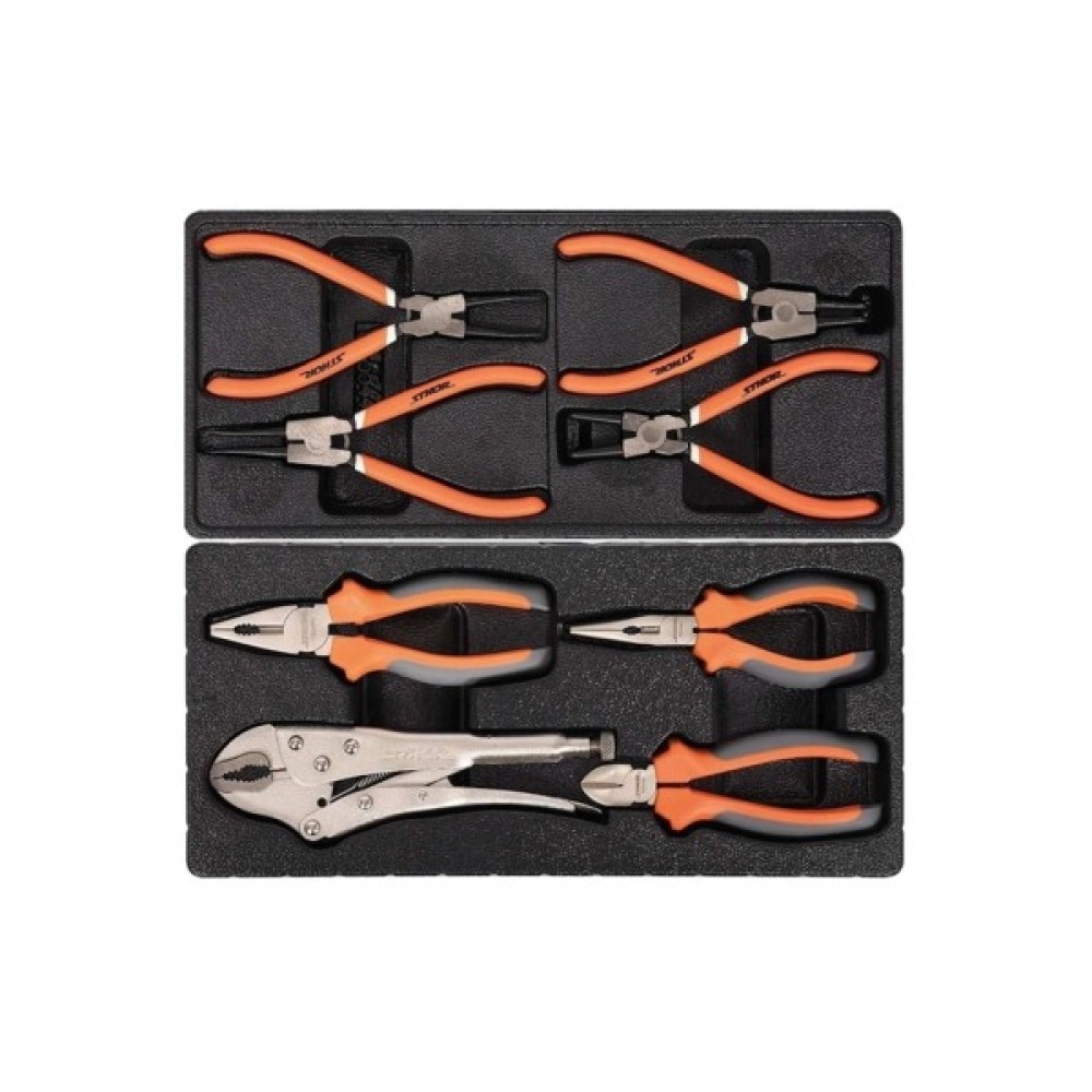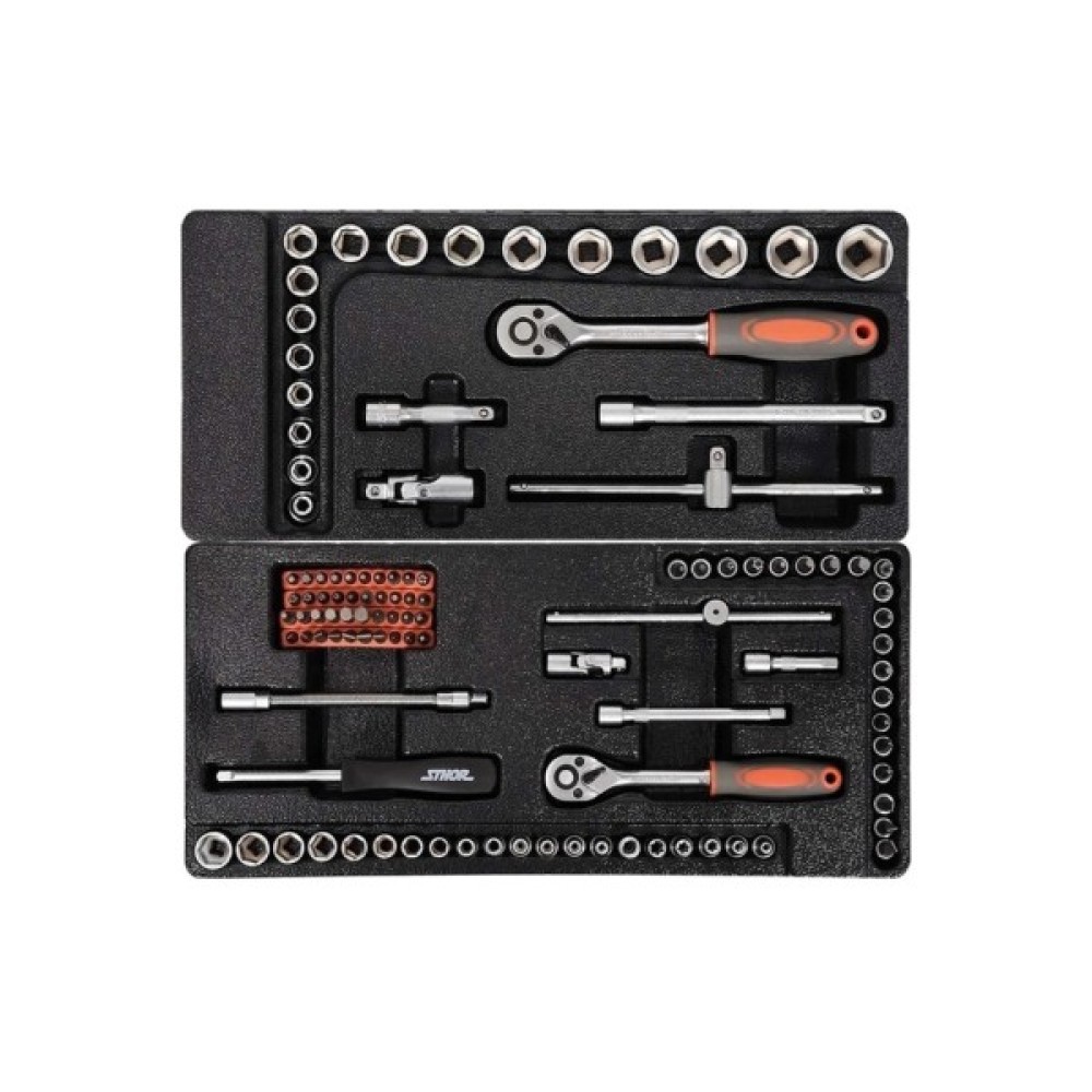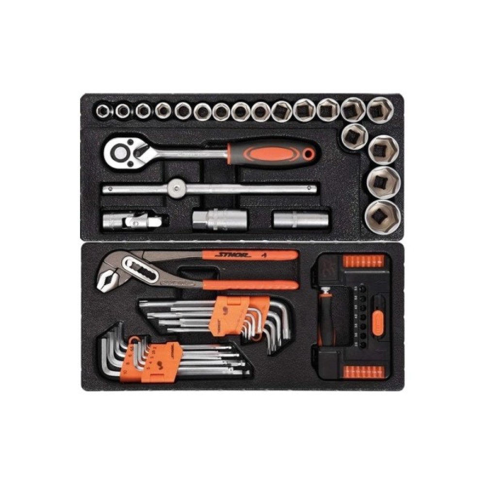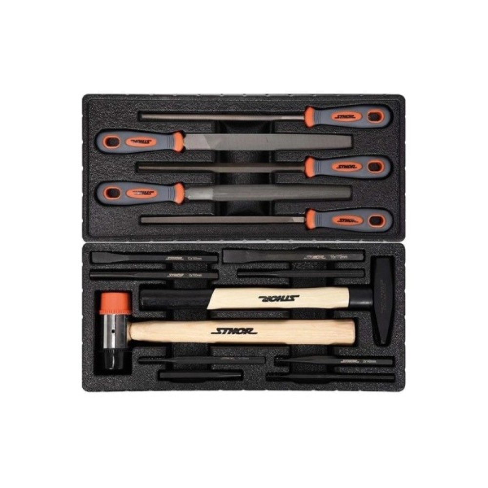 Сервісна шафа з інструментами STHOR. Має 6 висувних ящиків на кулькових напрямних, оснащених 12 пластиковими модулями з інструментами. Сервісна шафа STHOR містить 302 спеціально підібрані інструменти. Профілі шафи з листової сталі. Центральний замок і замок на кожну шухляду. Інструменти зі сталі CrV. Шафа має кутові бампери, які захищають від випадкових пошкоджень, наприклад, кузова автомобіля. Стільниця з міцного поліпропілену.
