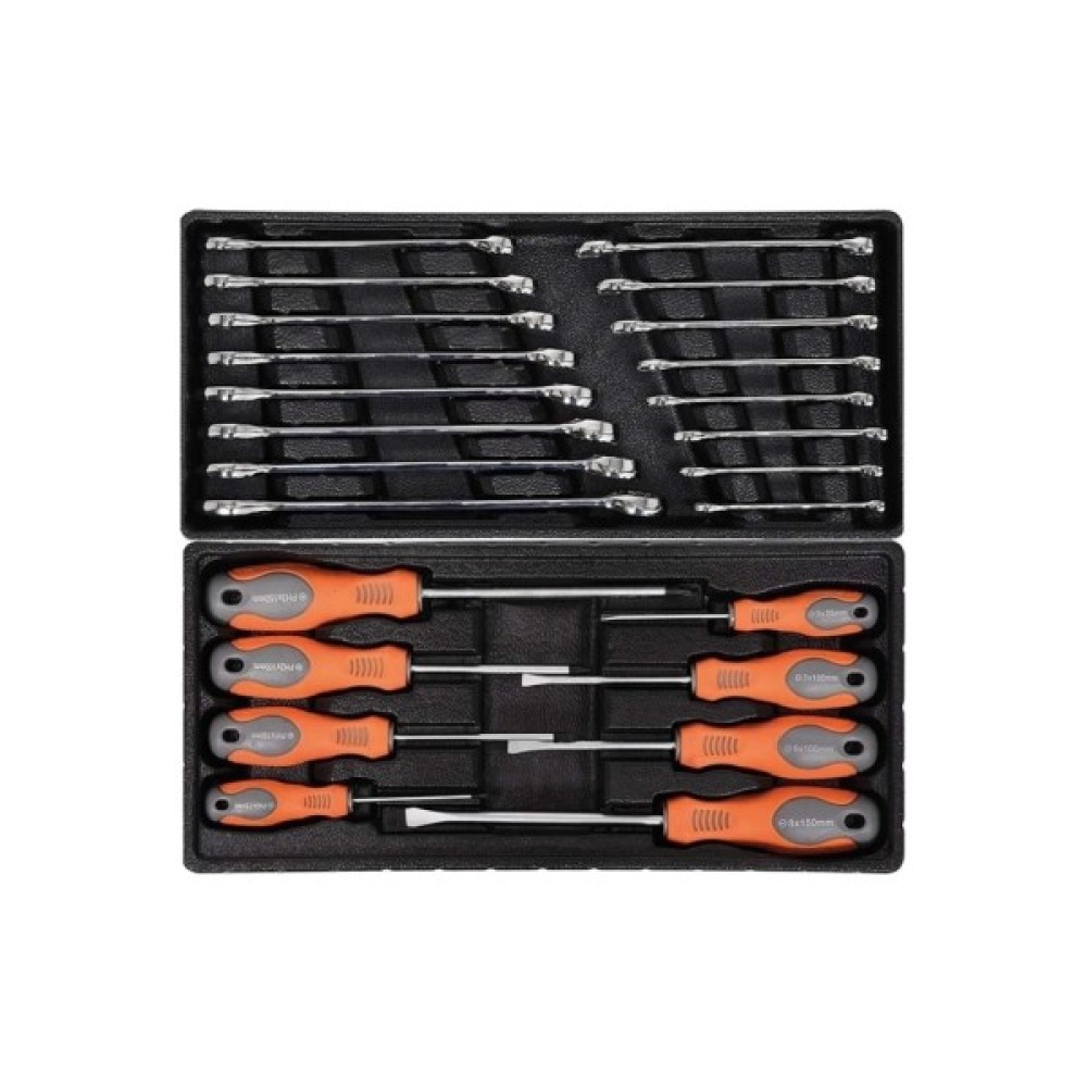 шарнірно-губцевий інструмент; викрутки; торцеві головки; інструменти для роботи з торцевими головками; гайкові ключі; біти; шестигранні/зіркоподібні ключі; молоток; тримач для біт; тріскачка; подовжувач; вороток; зубило; пасатижі; бокорізи; гострогубці; кардан шарнірний; напилок; головки для свічок запалювання; знімач стопорних кілець; кліщі з фікcaтopoм; кліщі переставні