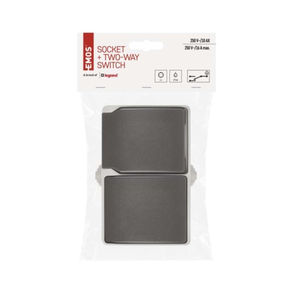 Вулична розетка, комбінована з вимикачем A1396.2 від чеського бренда Emos - це високоякісний водостійкий прийстрій, який поєднує в собі функціональність та стиль. Класичний дизайн корпусу виконаний в сіро-чорному кольорі,підходить для будь-якого екстер’єру. Вимикач працює при напрузі 250 В ~ та струмі 10 A,Розетка розрахована на навантаження 250 В 16 A, оснащена заземленням типу Schuko. Тип кріплення накладний (на стіну). Вимикач захищений від пилу та бризок води по стандарту IP44, гніздо розетки накривається кришкою.