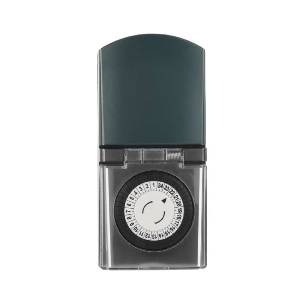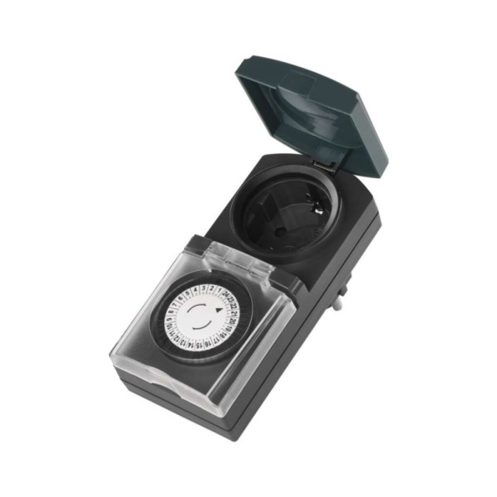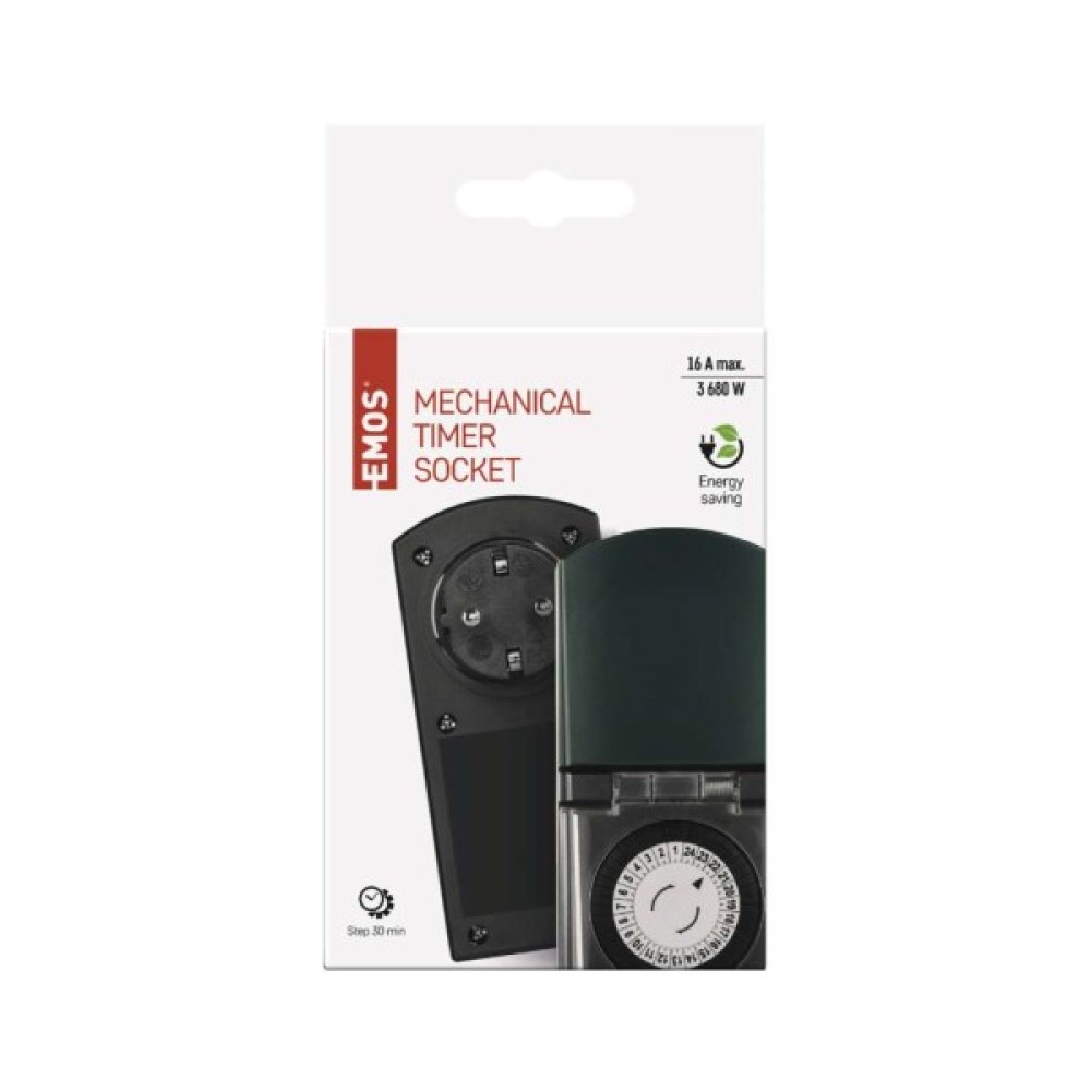Механічний таймер-розетка Emos P5526N в корпусі IP44, розрахований на роботу в приміщенні та на вулиці. Дозволяє автоматично вмикати та вимикати електричні прилади за встановленим розкладом.