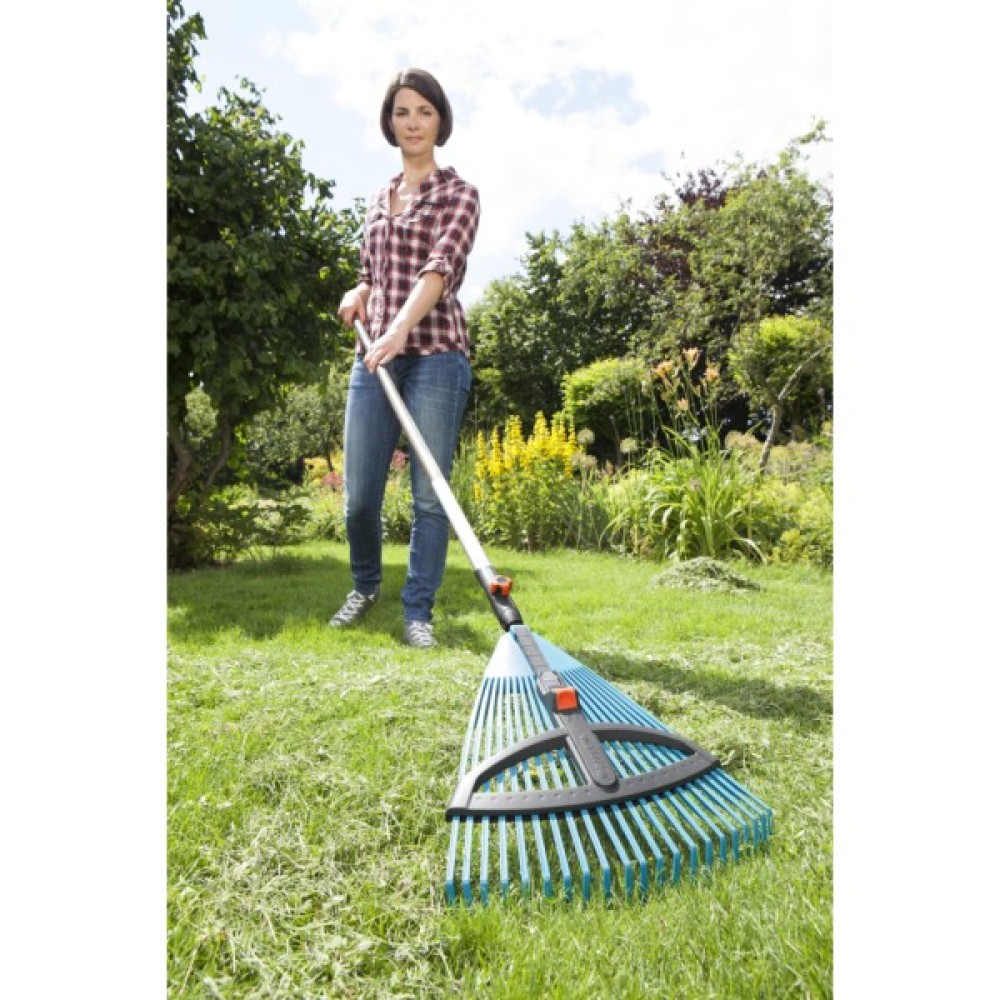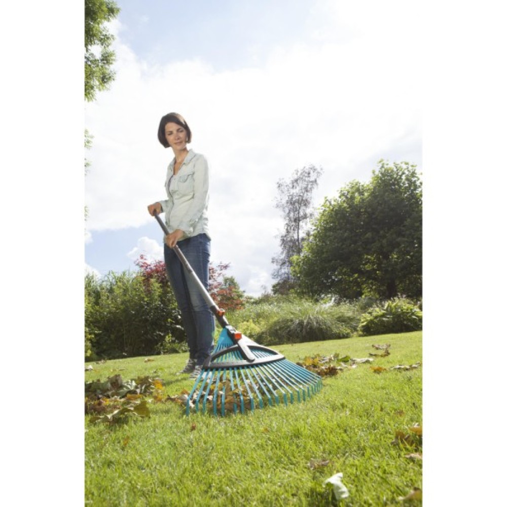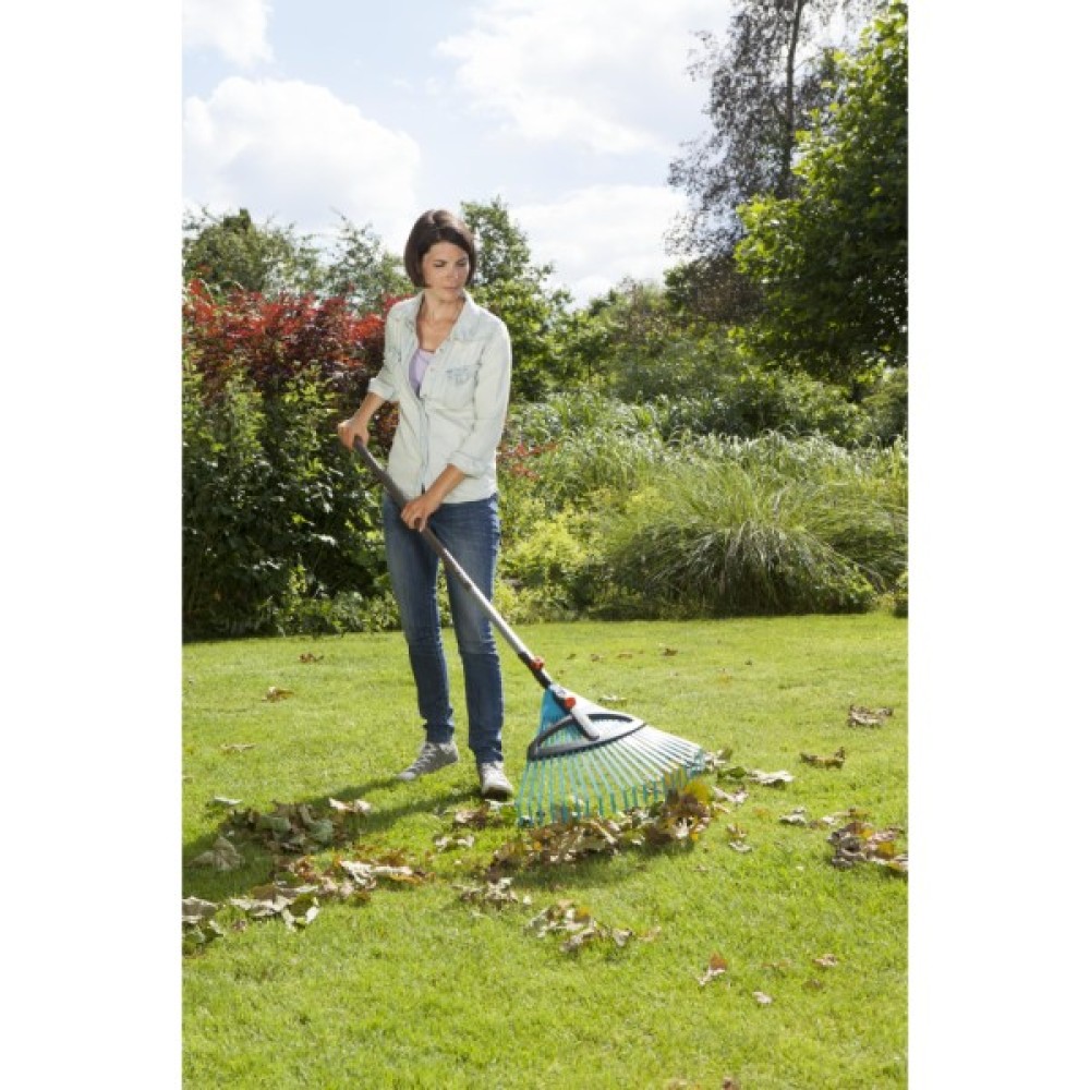 Граблі Gardena Combisystem пластикові віялові з регулюванням ідеально підходять для згрібання листя, скошеної трави та іншого садового сміття. Ширина між гнучкими пластиковими зубцями легко регулюється. Робоча ширина від 35 до 52 см дозволяє згрібати як великий, так і дрібний матеріал.