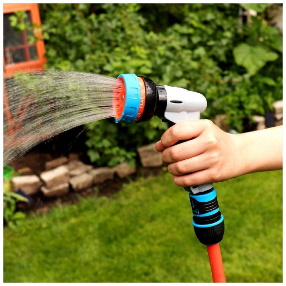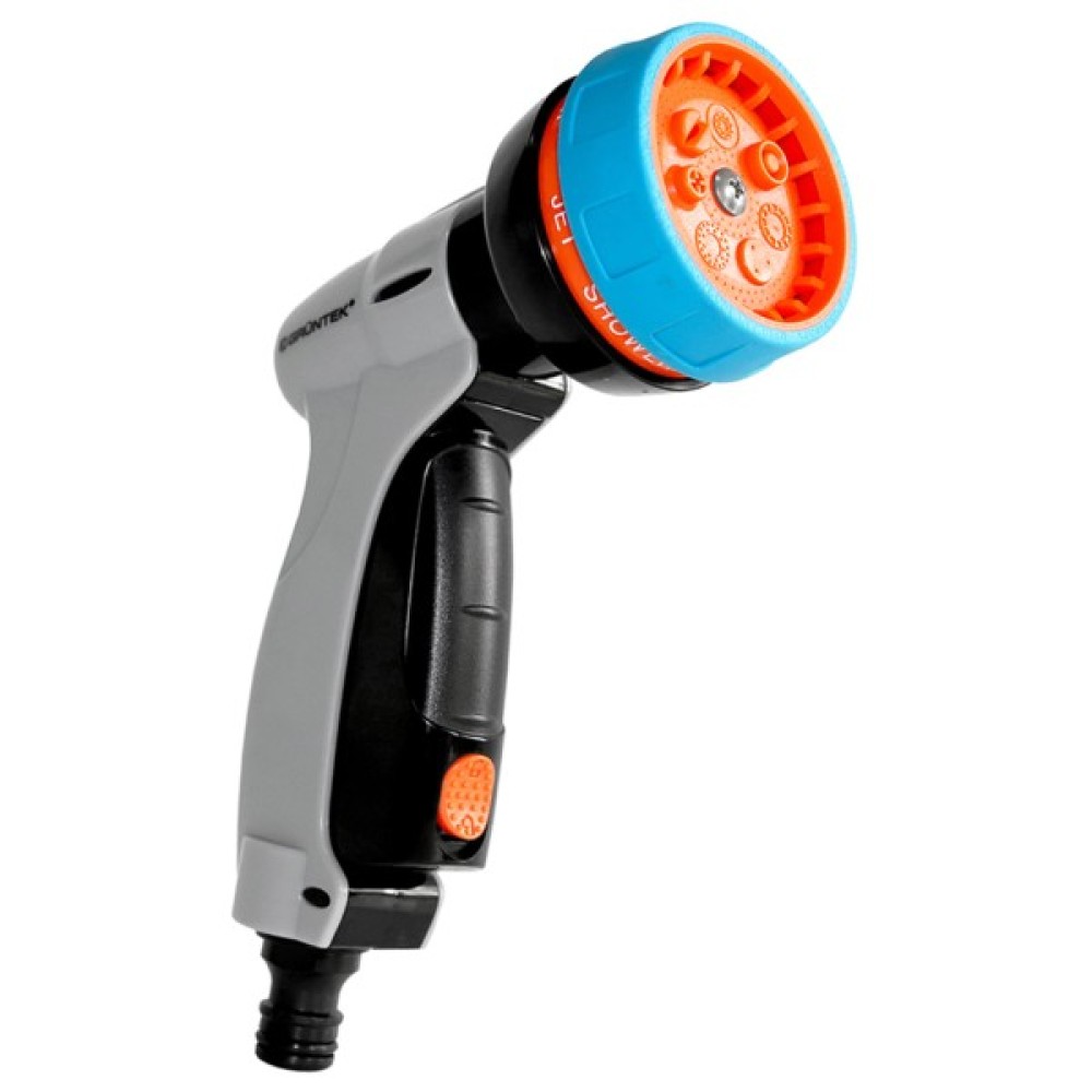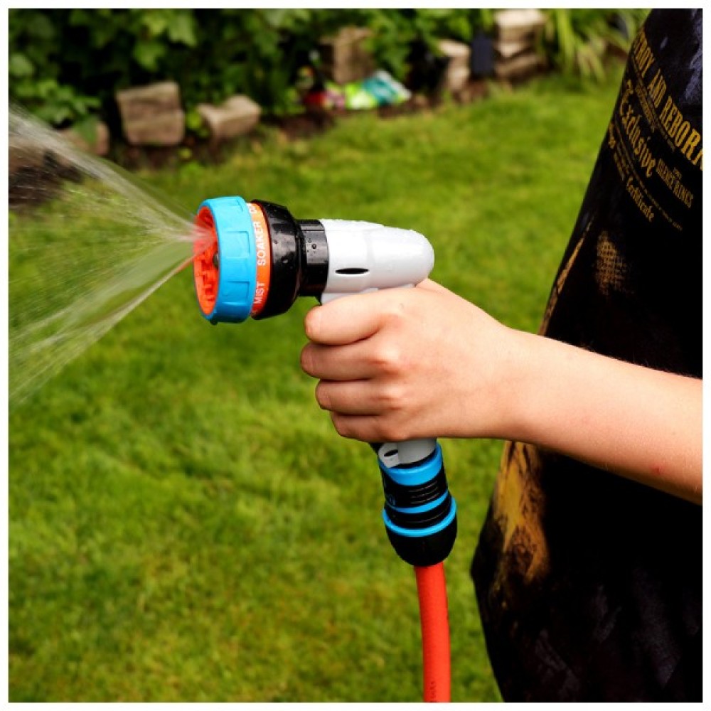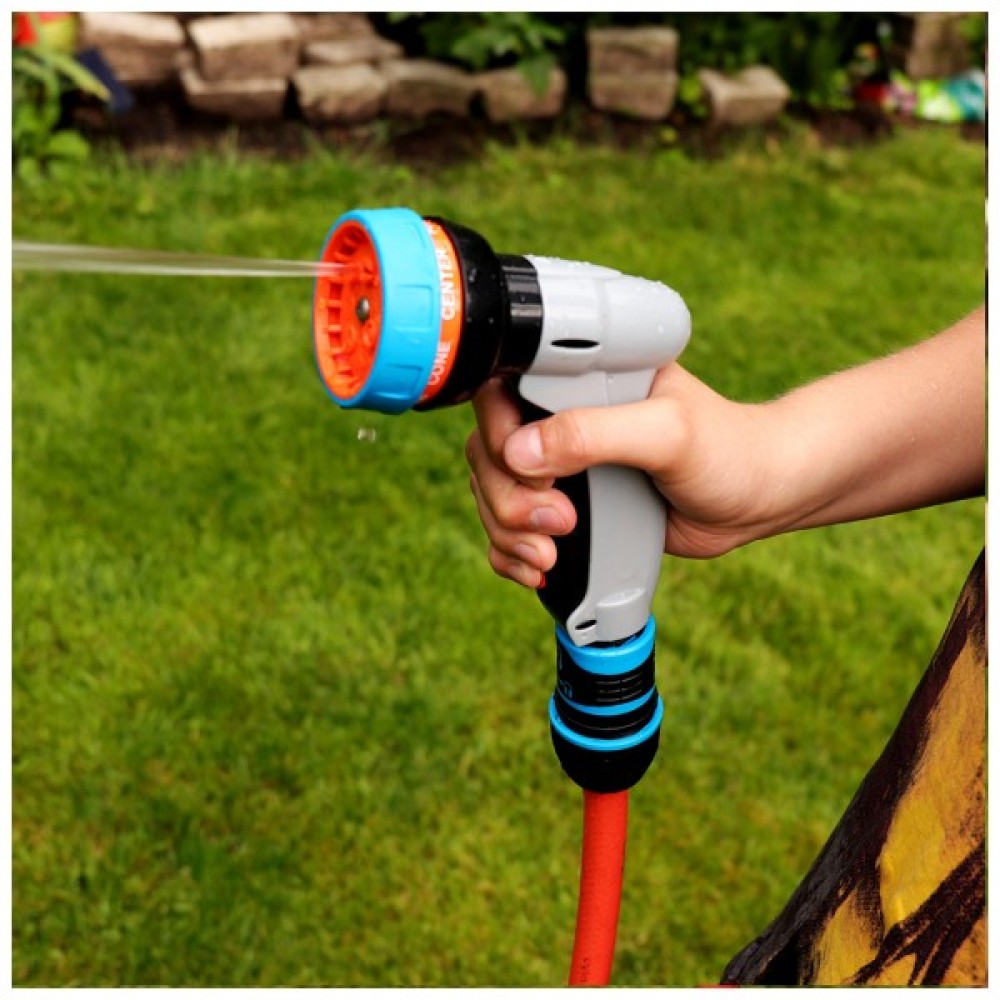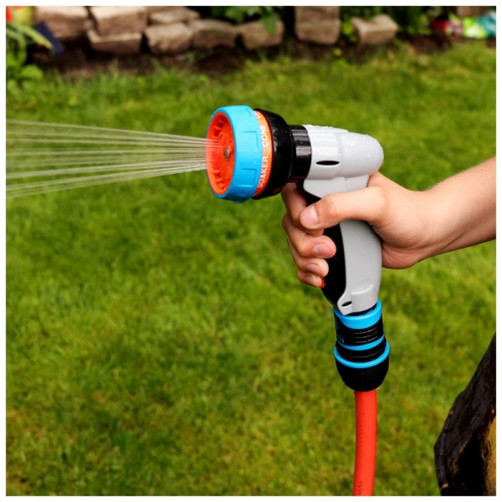 Пістолет для поливу легко регулює подавання води із 7 типами струменя: від точкового струменя до великого розпилення, що дає змогу виконувати різні типи робіт: від поливу до збирання. Є можливість зафіксувати кнопку увімкнення, полегшує напругу на руку в процесі поливу. Прискорює процес поливу садових рослин, допомагає силою напору змити навіть скам'янілий бруд із садового інвентарю й допомагає впоратися з побутовими завданнями на дачній ділянці, у саду.