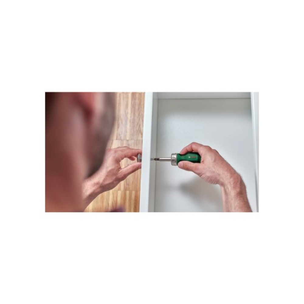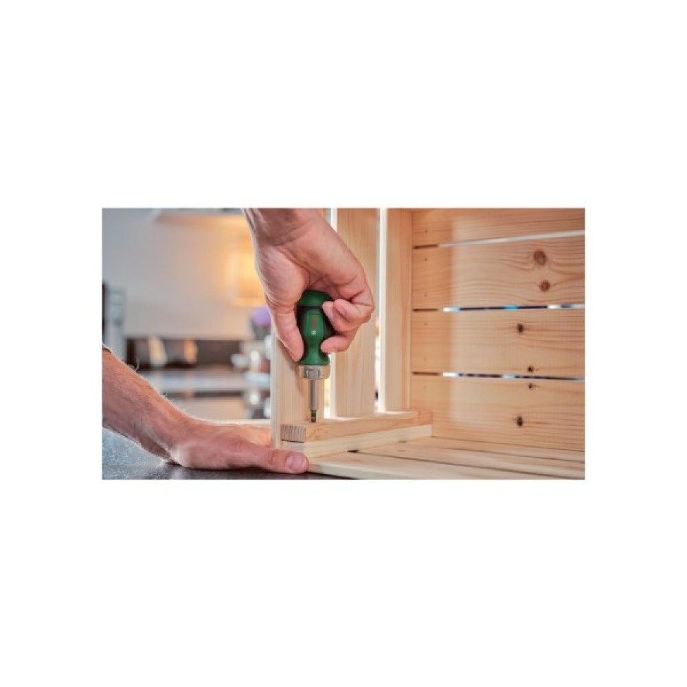 Коротка викрутка Bosch з храповиком і 6-ма бітами призначена для роботи в обмеженому просторі. Викрутка оснащена храповим механізмом, який забезпечує швидку та ефективну роботу з кріпленням, а також набором із шести змінних біт для роботи з різними типами кріплень. Вага 0.16 кг. Габаритні розміри 142х80х44 мм.