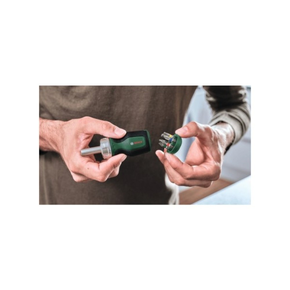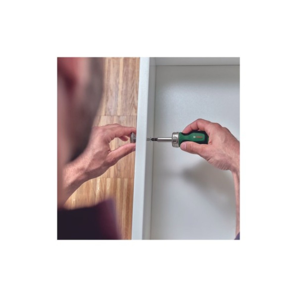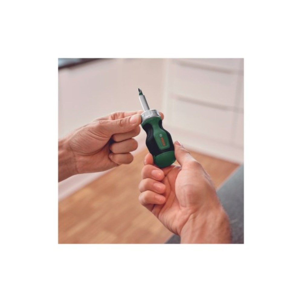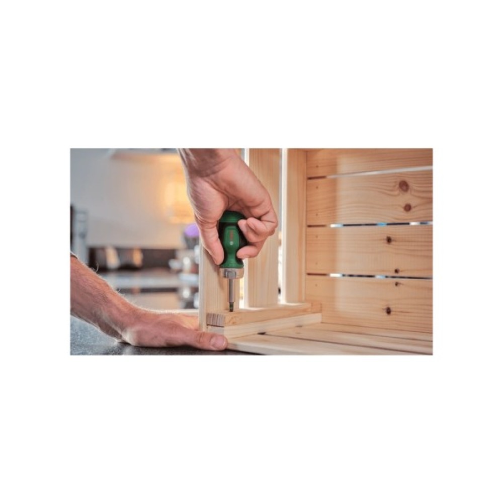Викрутка-тріскачка Bosch з 6 насадками в ручці - це зручний та практичний універсальний інструмент для швидкого та ефективного виконання домашніх робіт. Оснащена порошковим металургійним зубчастим колесом із 36 зубцями, тріскачка забезпечує високий крутний момент 50 Нм.