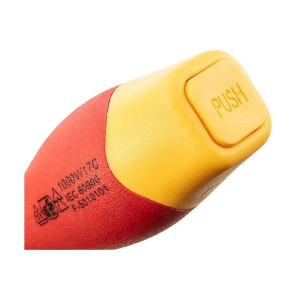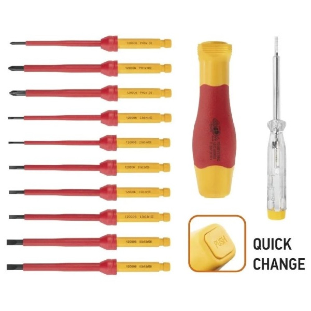 Набір змінних викруток наконечників NEO, що складається з 12 предметів, сертифікованих для роботи під напругою до 1000 В. Матеріал — легована сталь S2, завдяки якій твердість змінних наконечників становить 60 HRC, що куди підвищує їхню міцність та якість роботи. До набору входить багатий пакет наконечників стандартного та спеціалізованих типів завдовжки 100 мм. Додатково до набору входить тестер напруги 1000 В.