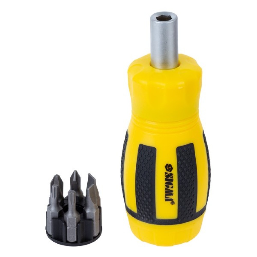 Викрутка Sigma з реверсом MINI (4001811) - це багатофункціональний інструмент, який стане незамінним помічником у вашому арсеналі. Ця викрутка-тримач, оснащена храповим механізмом, дозволяє швидко та легко змінювати біти, що значно спрощує роботу. У комплект входить 6 змінних насадок, включаючи плоскі (SL), хрестоподібні (Phillips / PH) та зіркоподібні (Torx / T) біти, що забезпечує універсальність використання. Ергономічна рукоятка виготовлена з комбінованих матеріалів - гуми та пластику, що забезпечує комфортний хват і мінімізує ковзання. Виготовлена з міцної сталі CrV, викрутка відзначається високою зносостійкістю та надійністю у використанні. Незалежно від типу завдання, ця викрутка гарантує точність та зручність виконання будь-яких робіт.