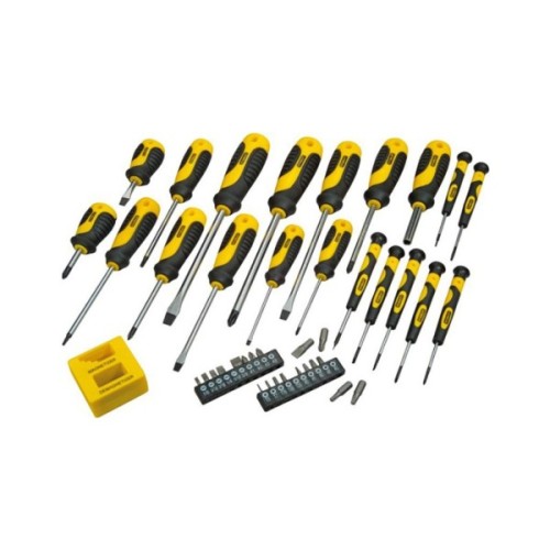 Набір викруток 42 одиниць із пристроєм намагнічування/розмагнічування. Стрижні з високоякісної хромо-ванадієвої сталі. Ручки з м'якими вставками для високого комфорту та надійного контролю інструмента. Маркування для ідентифікації шліца та розміру викрутки нанесене на ручку. Зручна сумка для перенесення та зберігання набору. Відповідає всім вимогам стандарту ANSI. Характеристики викруток: кількість викруток у наборі: 19 шт., тип викруток у наборі: звичайні, прецизійні (для точних дрібних робіт), тип шліца: плоский (PL), хрещатий із зарубками (PH), зірочка (Torx); Ручки викруток: стандартні; Розміри викруток: звичайні.