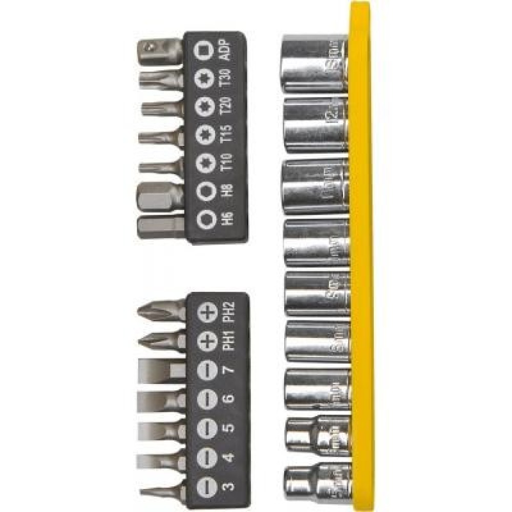 Деталі: Змінні наконечники з тримачем, двокомпонентна рукоятка з тріскачкою з блокуванням ліво, право, наконечники: шліцьові 3, 4, 5, 6, 7 мм, PH1, PH2, PH3, PZ1, PZ2, PZ3, T10, T15, T20, T30, H3, H4, H5, H6, H8, перехідник квадрат 1/4, шестигранник, шестигранні головки: 5, 6, 7, 8, 9, 10, 11, 12, 13 мм, тримач у формі авторучки з наконечниками PH1 x 5, 32 і PH0 x 1, 8.
