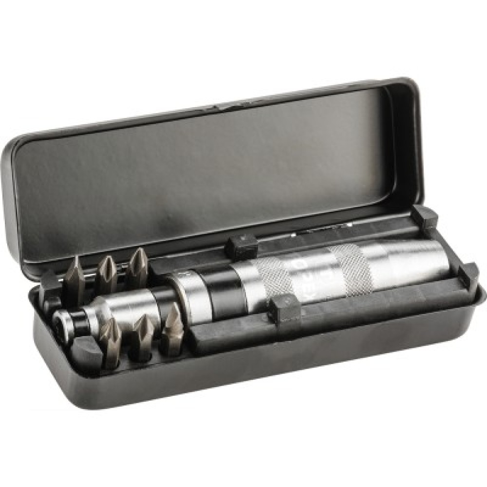 Викрутка ударна, набір 7 шт., рукоятка викрутки 1/2, перехідник для змінних наконечників 1/2 x 5, 16, 5 змінних наконечників 35 мм, шліцьові 7 мм, 8 мм, хрестові PH2, PH3, 2 змінних наконечника 75 мм, розміри: 8 мм, PH3.