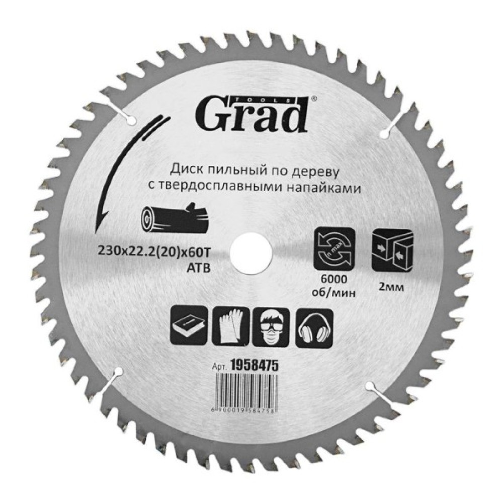 Диск пильний Grad по дереву з твердосплавними напайками Ø230×22.2(20)×60Т, 6000об/хв GRAD (1958475) (1958475)