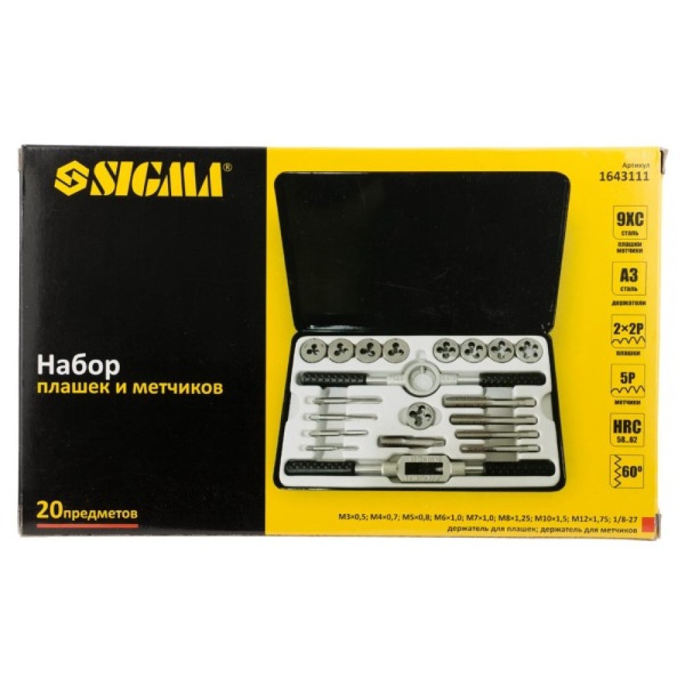 тримач для плашок - 1 шт; мітчики - 9 шт; плашки - 9 шт; тримач для мітчиків - 1 шт
