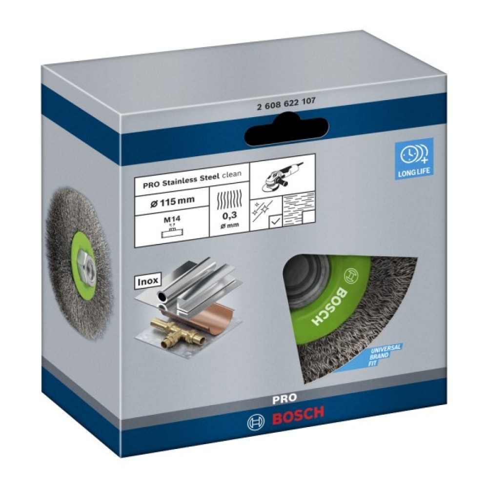 Дискова щітка Clean for Inox для надзвичайно тонкої обробки поверхні. Хвилястий дріт для легкого та середнього очищення. Видалення кольорів побіжалості зі зварних швів, очищення малих сталевих поверхонь, країв і канавок на високій швидкості. Підходить для всіх кутових шліфувальних машин із різьбою М14.