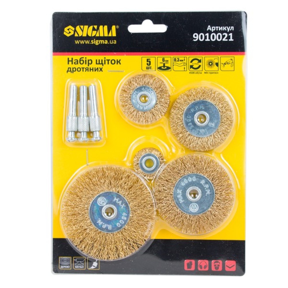 Щітка для електроінструменту Sigma набір 5шт, 25; 38; 50; 65; 75мм, хвостовик 6мм, латуновані (9010021)