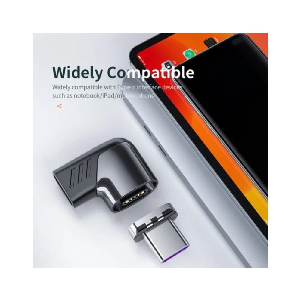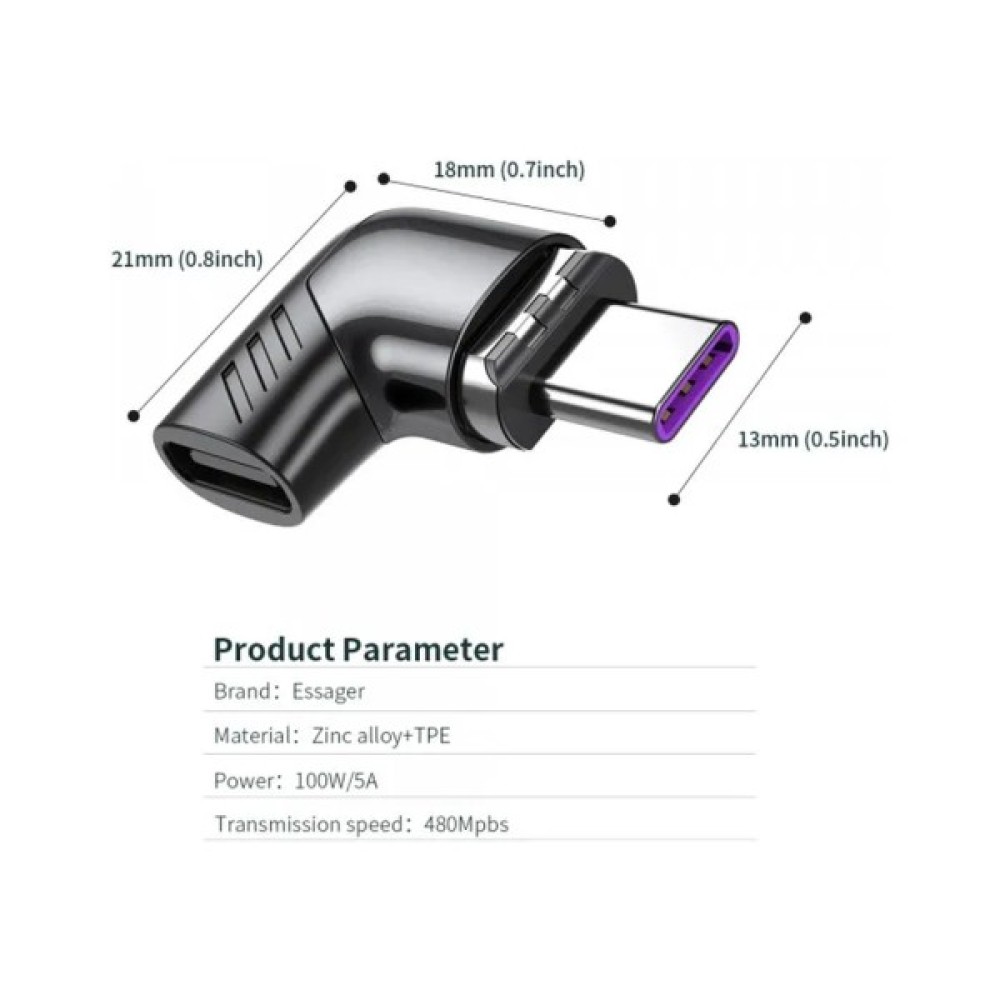 Розумний дизайн адаптера ESSAGER 100 Вт USB-C на USB-C під кутом 90 градусів дозволяє під'єднати зарядний кабель USB-C до телефону, iPad або ноутбука, не заважаючи вам користуватися телефоном. Магнітність адаптера гарантує, що ви можете залишити роз'єм у порту (зарядки). Усередину пристрою не потрапить вода, пил та інший бруд. Завдяки підтримці протоколів швидкого заряджання, зокрема Quick Charge 4.0 та Samsung Adaptive Fast Charge, ви можете дуже швидко заряджати пристрої з максимальною потужністю зарядки 100 Вт/5 А або обмінюватися даними зі швидкістю передачі до 480 Мбіт/с.