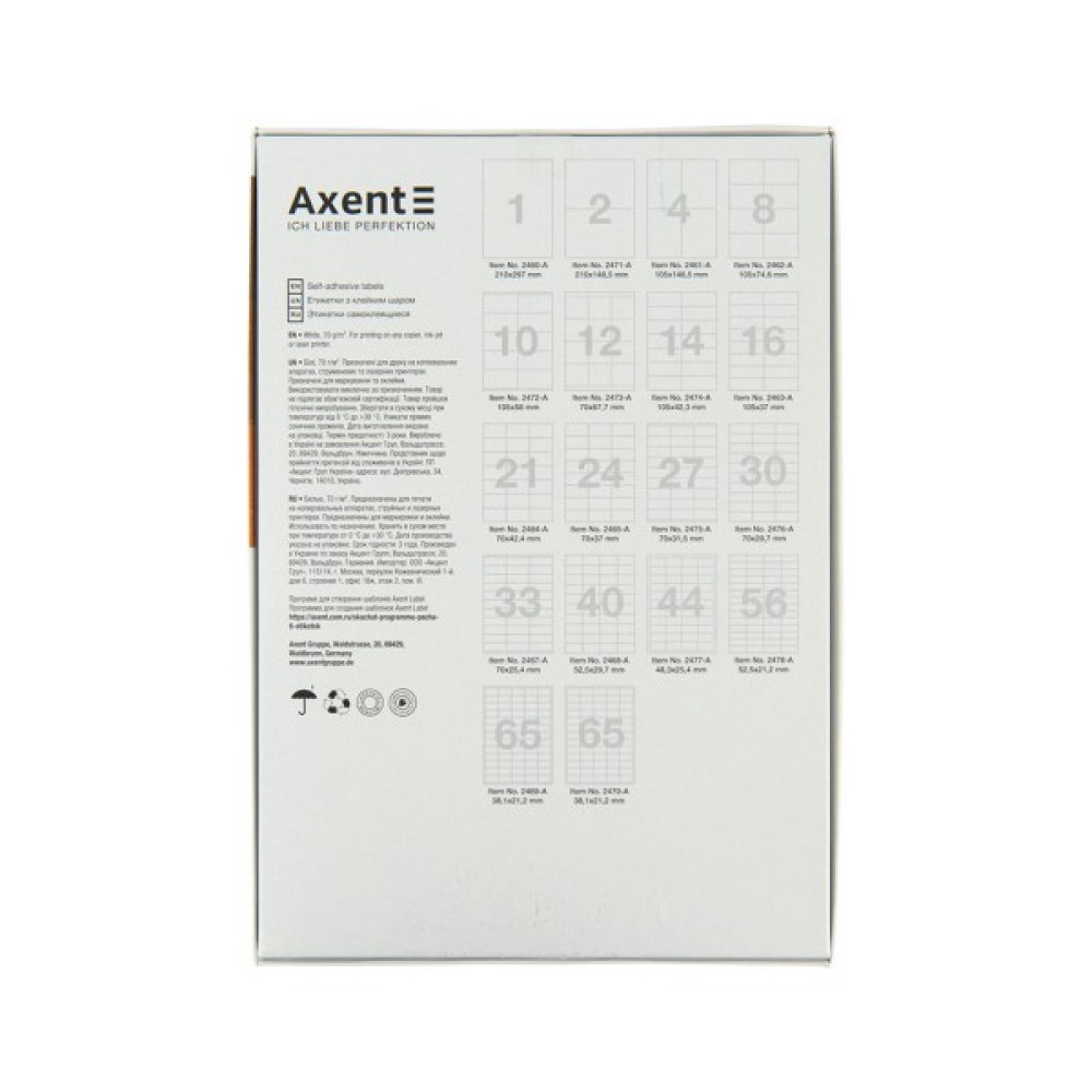 Самоклеючі етикетки Axent 2471-A, А4 - 2 штуки на аркуш, призначені для лазерних та струменевих принтерів, а також копіювальних апаратів. Використовуються для адресації аркушів та посилок, штрих кодування товарів, класифікації документів. Високоякісний папір UPM JETLASER, силіконова підкладка: друк добре тримається, не дає запахів у принтері, етикетки акуратно відклеюються від основи. В асортименті є етикетки з закругленими краями. Формат А4, 100 аркушів. Щільність 70 г/м2. Упаковка – картонна коробка. Колір – білий.