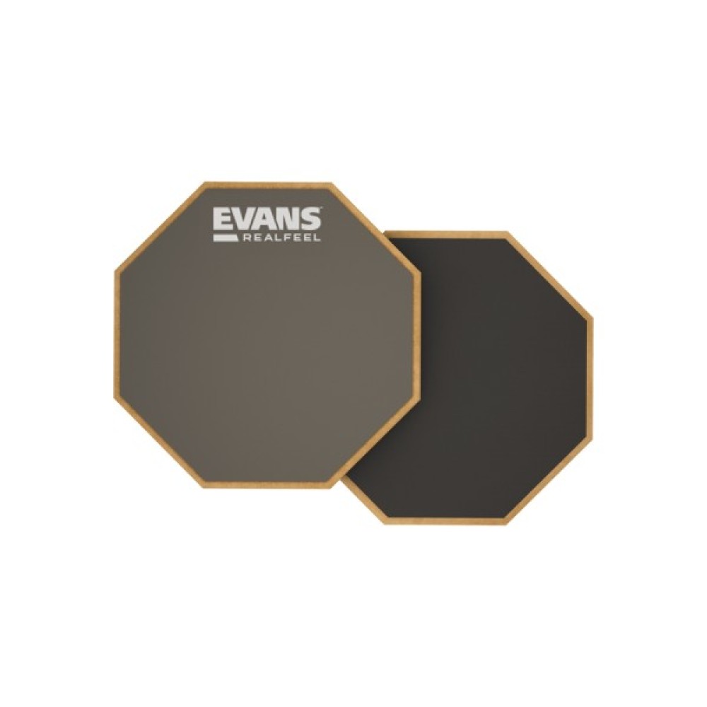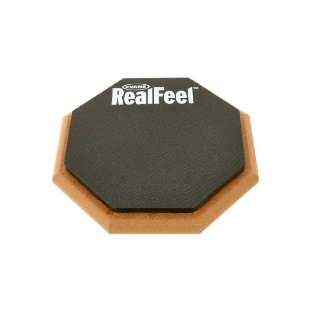 Двосторонній 6" пед Evans RealFeel з одного боку покритий м'якою і пружною гумою з фактурним покриттям, а друга сторона виготовлена ​​з переробленої гуми та відрізняється більш високою жорсткістю. Завдяки натуралістичному відскоку паличок, педи RealFeel забезпечують найкращу заміну акустичним барабанів.