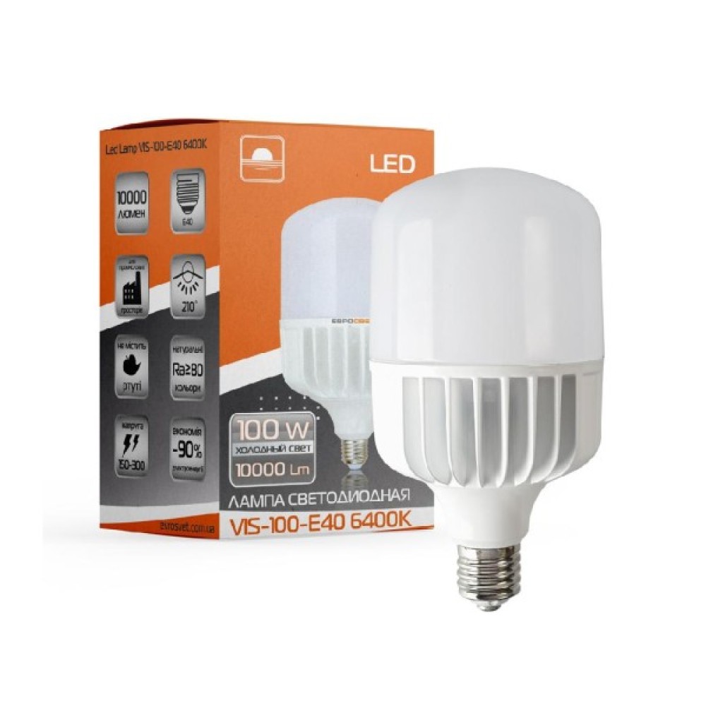 Лампу світлодіодну високопотужну Євросвітло 100Вт 6400К (VIS-100-E40) беруть для складів, заводів, промислових підприємств і вулиці. Вона дає рівномірне потужне світло і споживає в 10 разів менше електроенергії, ніж лампа розжарювання такої ж яскравості.